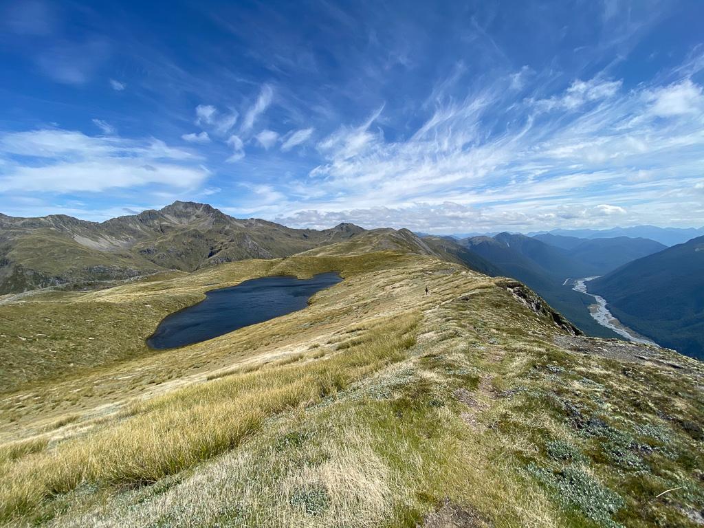 The day starts by climbing back up towards Lucretia but taking a right hand turn down into Lucretia Stream. There is a little track from the saddle and a series of tarns which will guide you towards a rather narrow looking ridge into the valley. Rest assured this is the right way to go! I couldn’t find when James Broadbent cut the route, but there are references to it back to 2008.