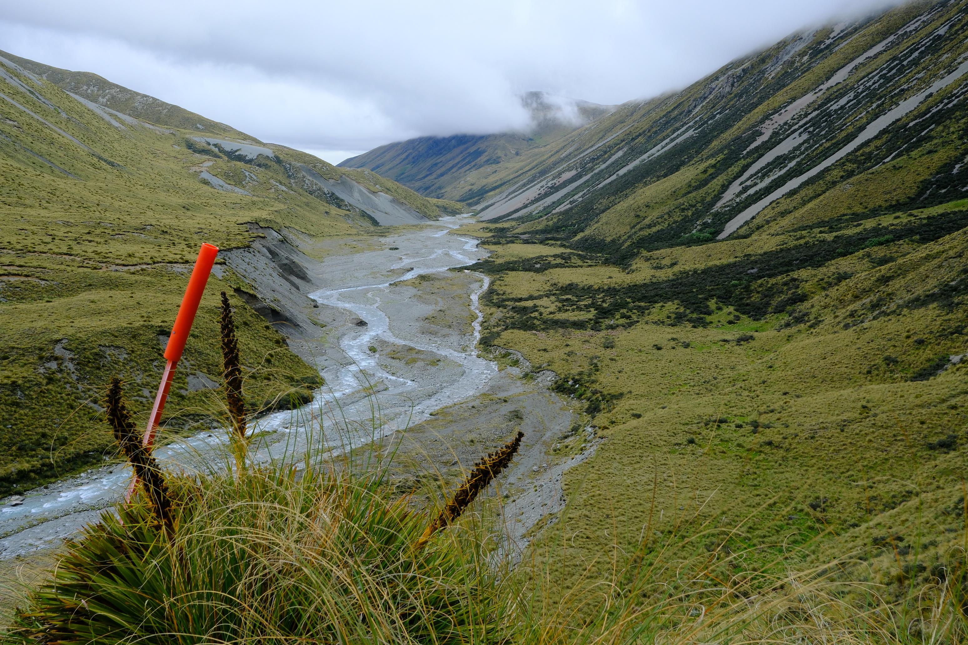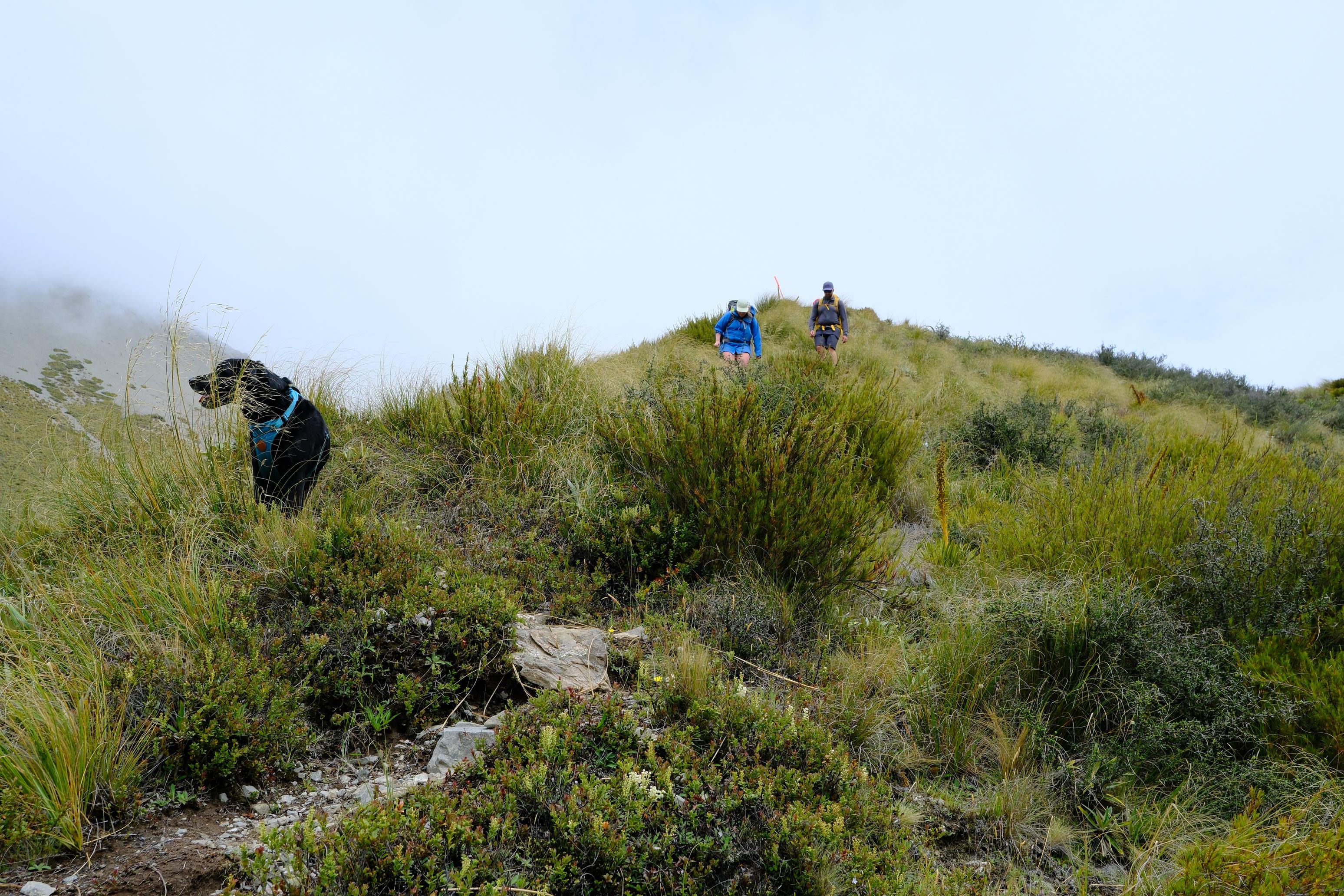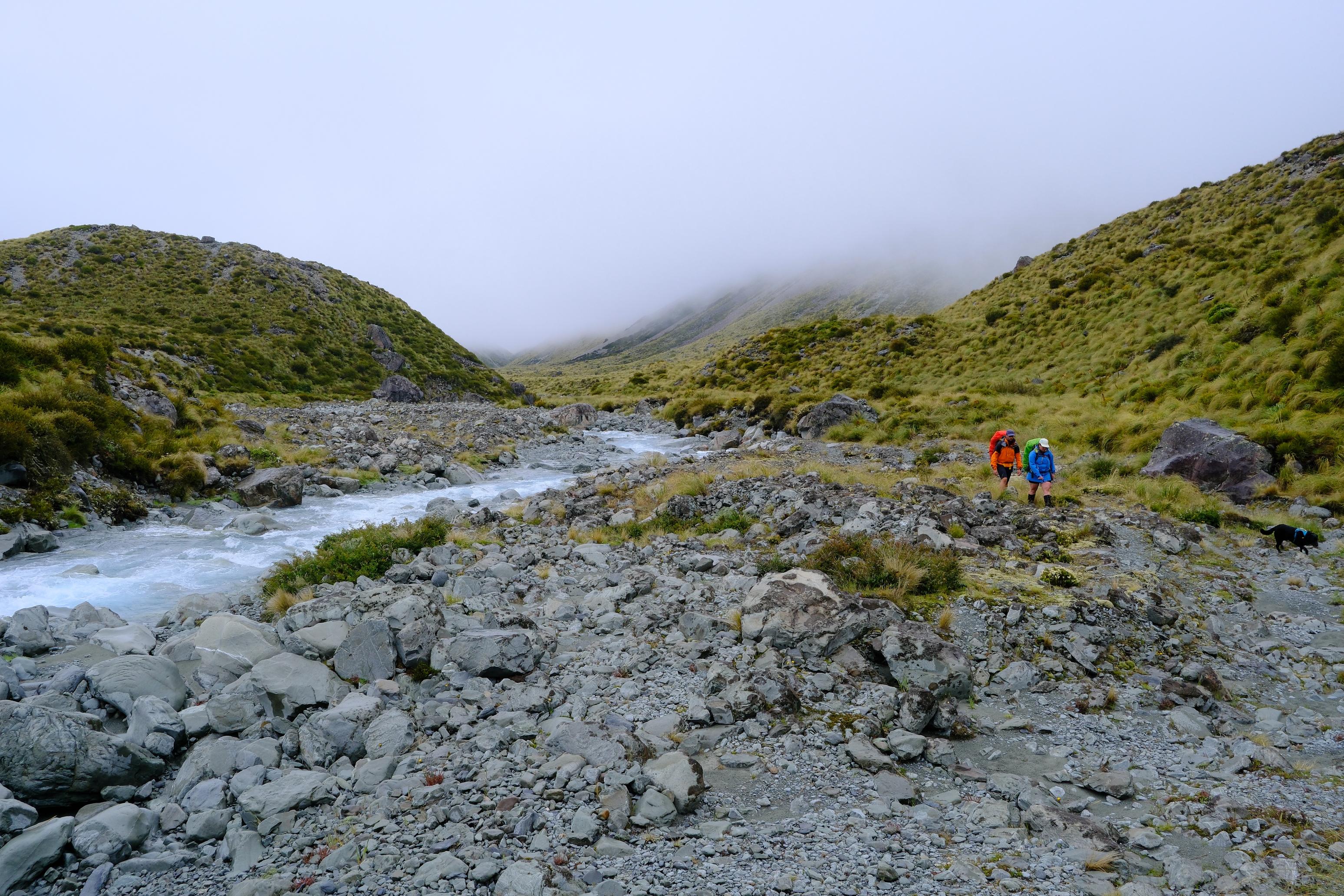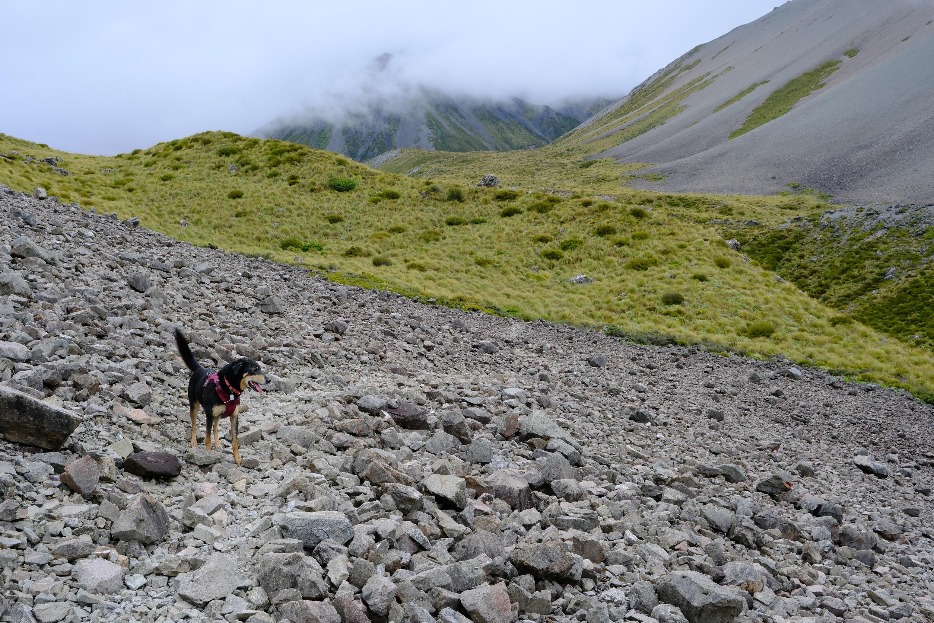 We arrived and the hills were grey, cloudy and looking like they would be drizzly soon. Still, we headed off into the wet grass and slightly overgrown track. The dogs had a great time with lots of things to smell and water to drink. The track is all very straightforward, climbing slowly and steadily up the valley. It sticks to the true right for the duration of the track, too.