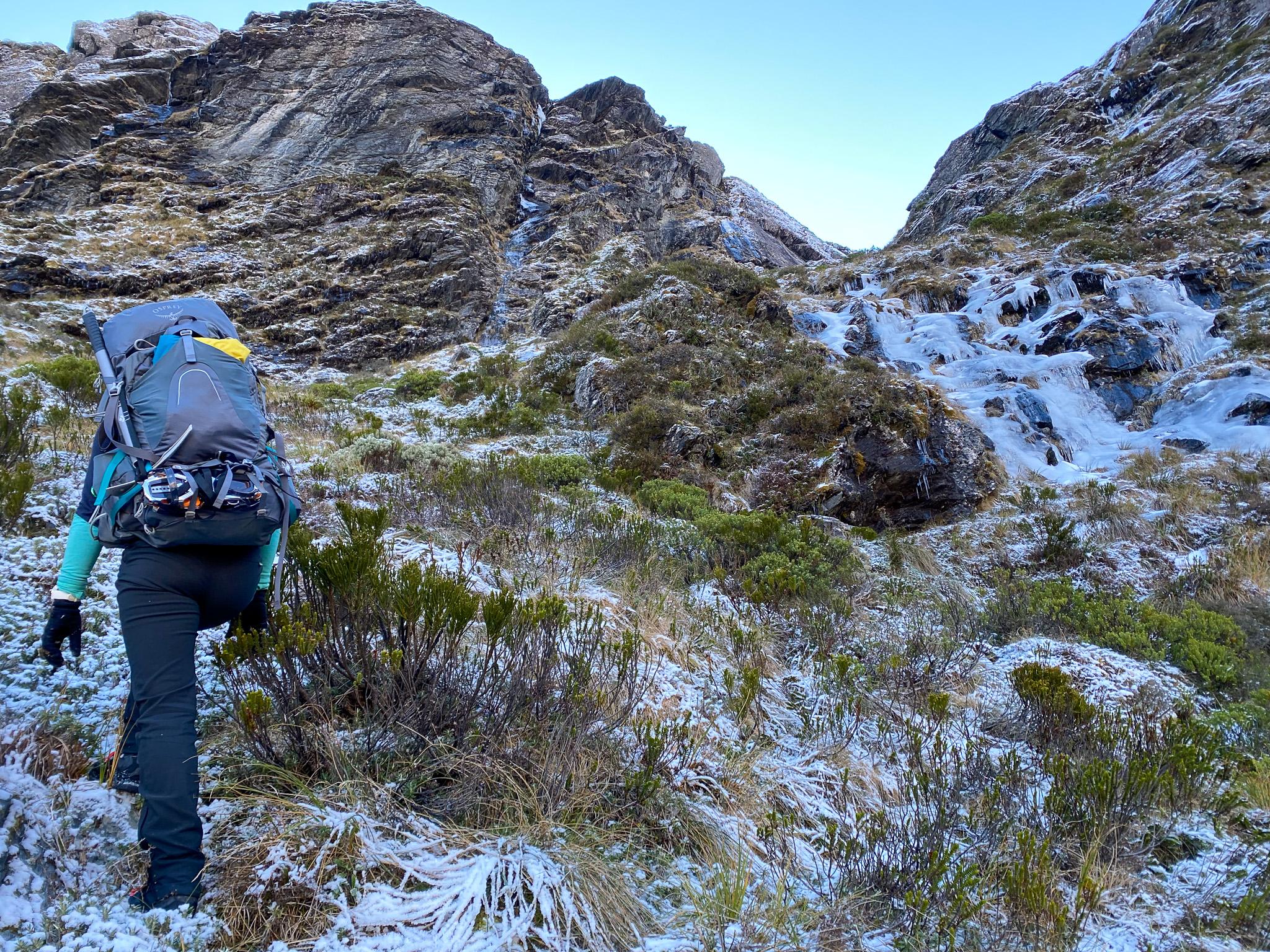 After a poor night sleep, I was not feeling excellent, and due to the sub-zero temperatures, we were moving very slowly up Kay Creek towards Scott Basin (somewhere in the range of 1-2km/h). I wasn’t enthused about the river crossings, nor the slippery boulders but after an hour or so I got into it.