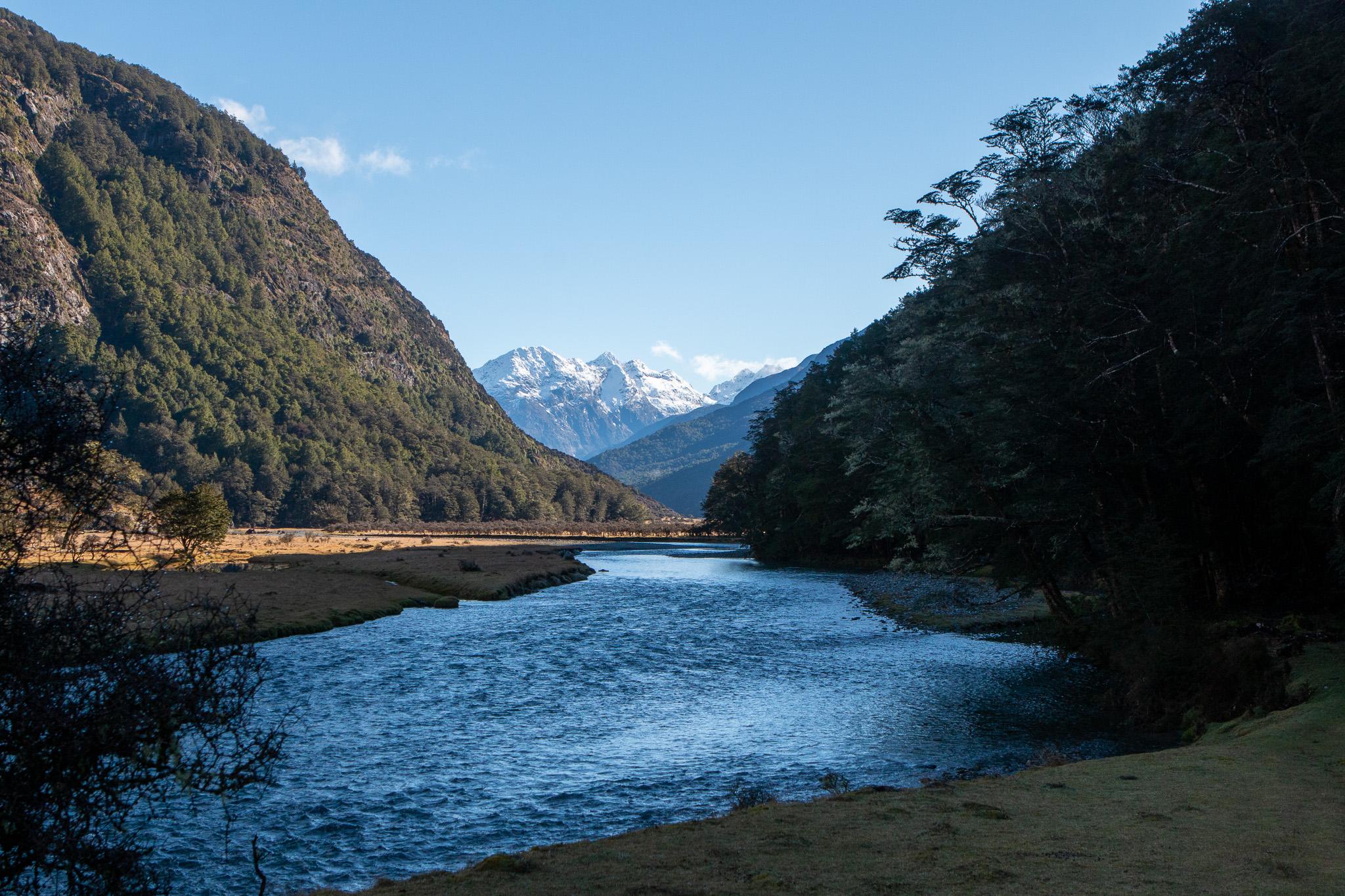 This section of track is very well-formed, well maintained and quite simply follows the Caples Valley up to Upper Caples Hut. Because it was Winter we were a little careful about getting our feet we earlier than necessary, so stuck to the track, but if it were a beautiful Summer day you could very easily walk straight up the riverbed and have a great time.