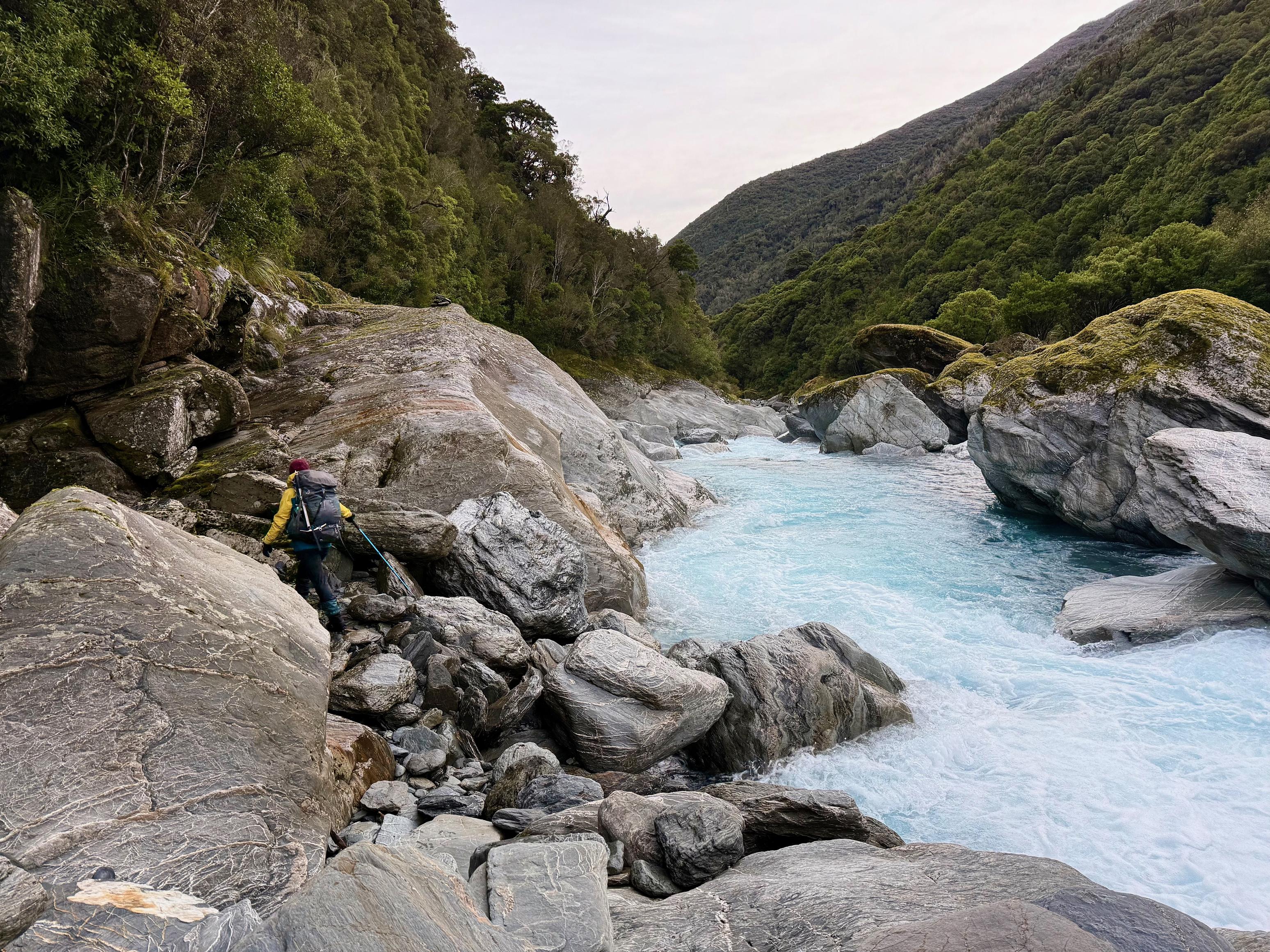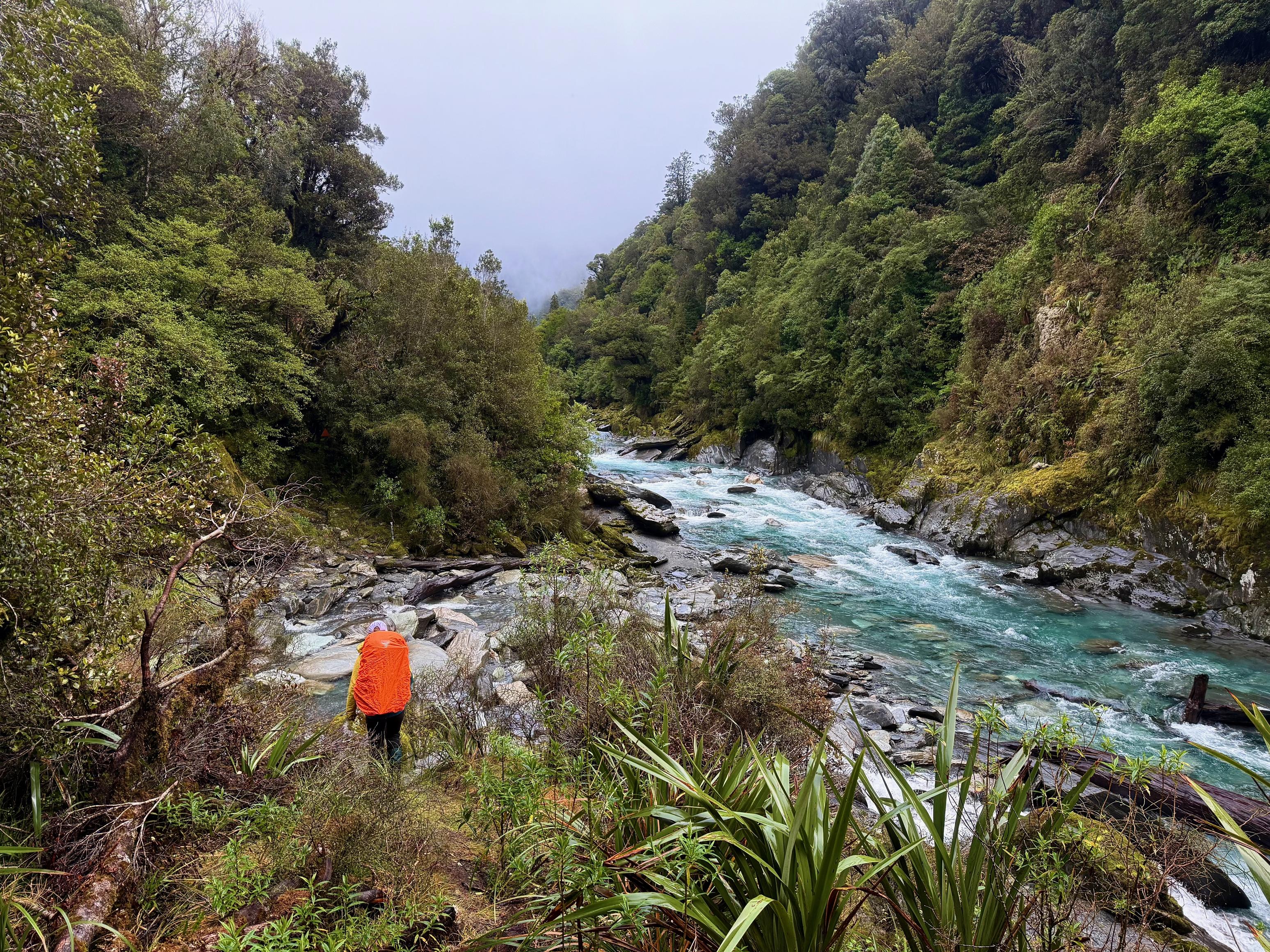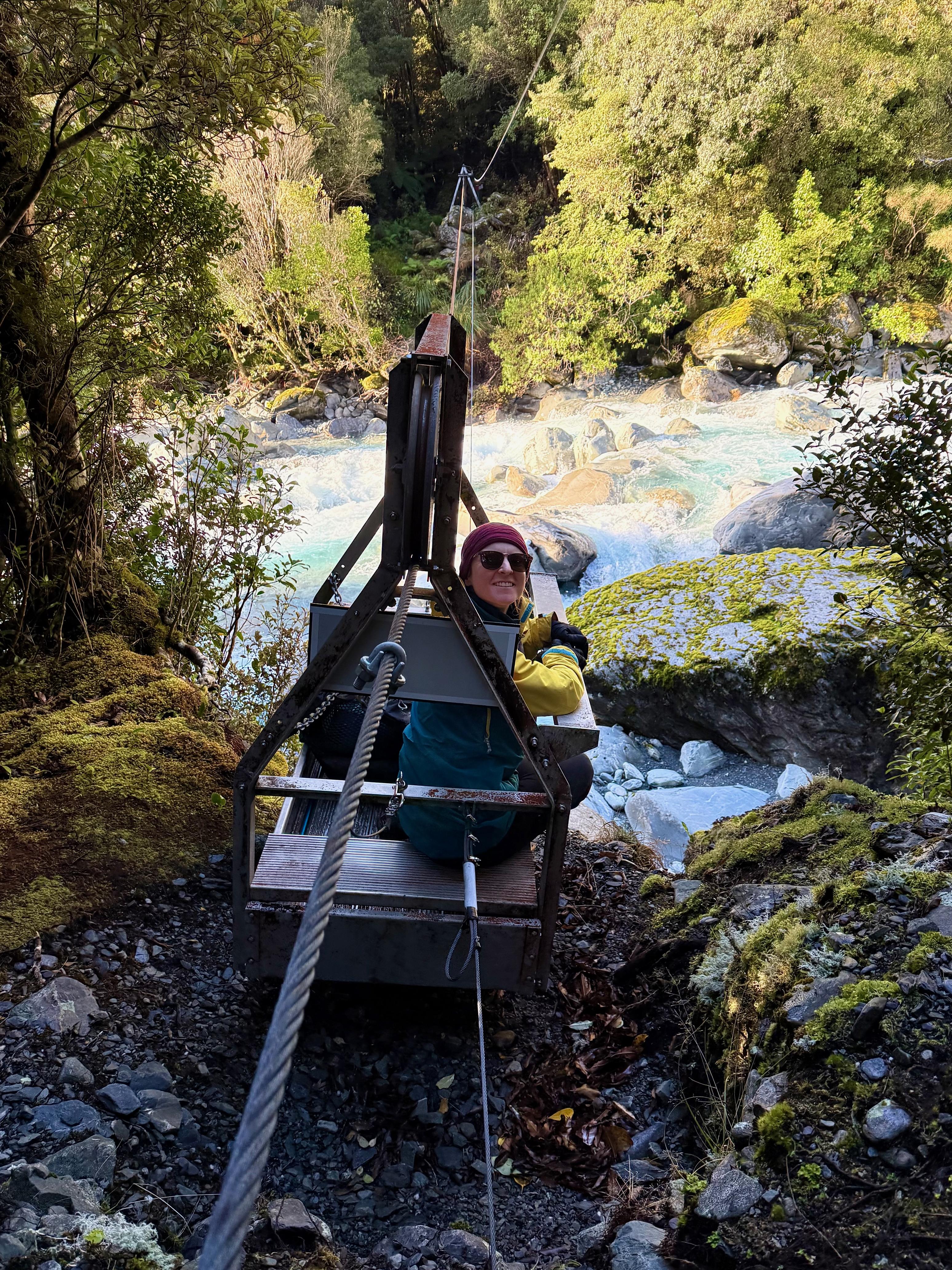 The cableway was fun and a much smoother experience than the one I tried down at Olivine Hut! The crossing was quick and easy, but I think doing it solo with the odd lever thing would have been hard work! From the cableway, the โtrackโ continues down the true right riverbed for a couple hundred meters before entering the bush and arriving at the hut. We saw two whio just before we left the river! Stoked.