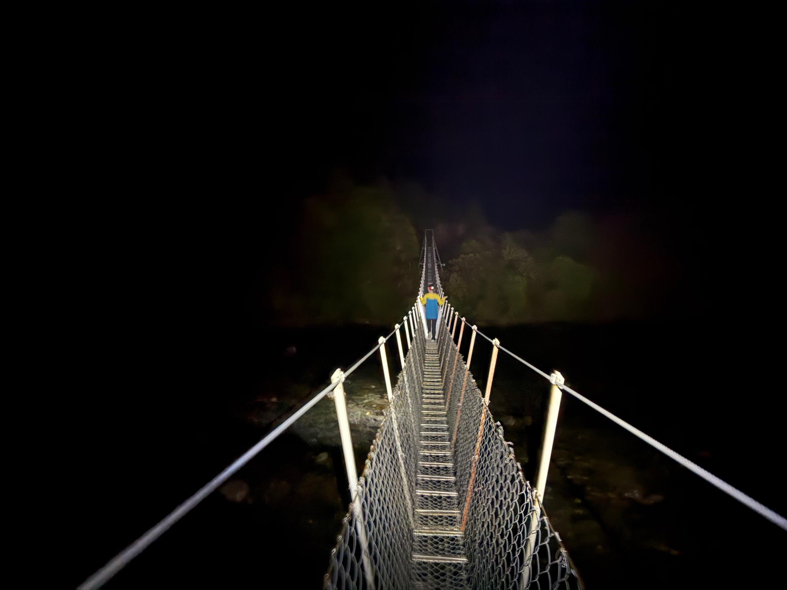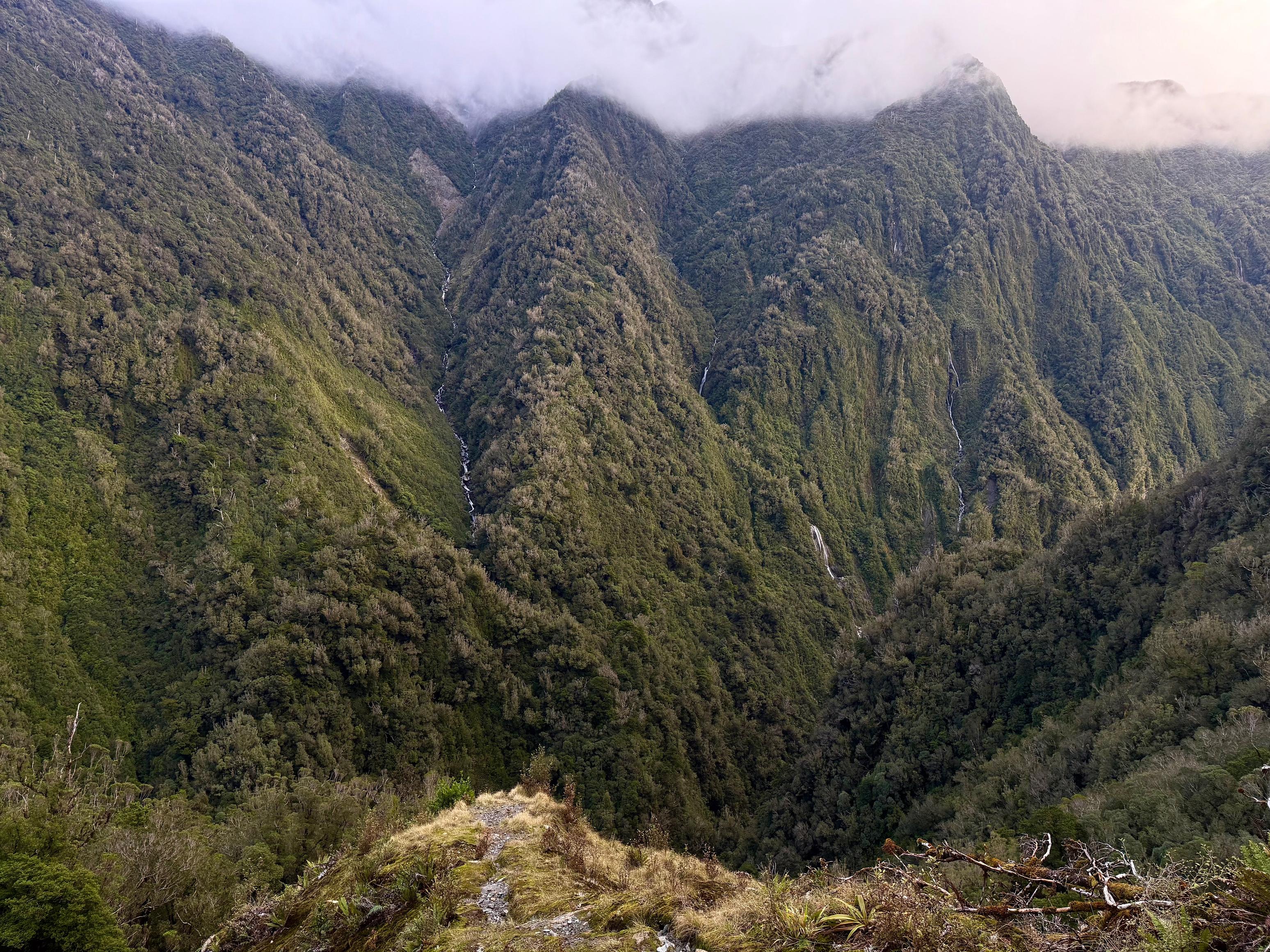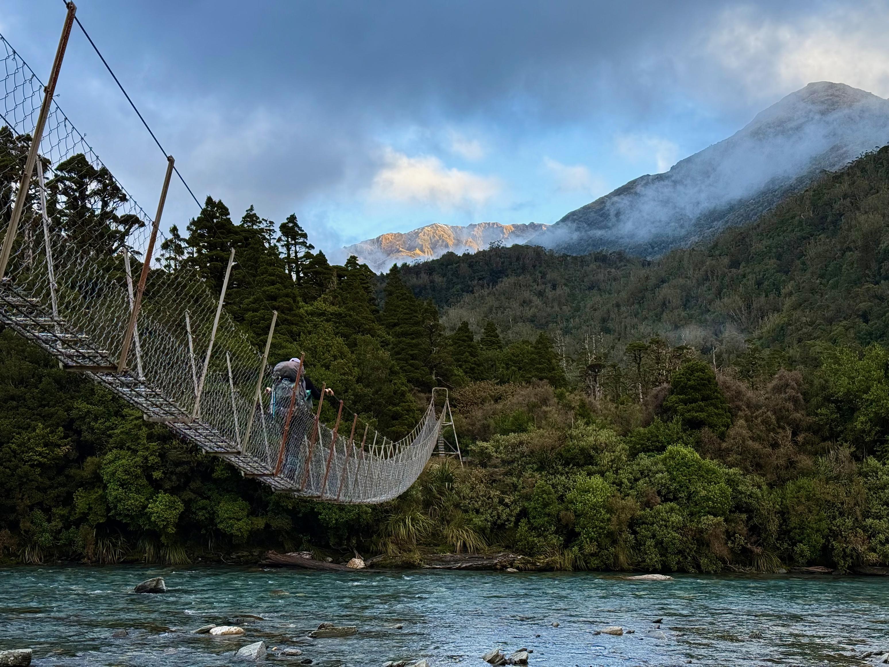 After a lazy start (I rolled out of bed after 8am!) we hit the track just before 10am. It rained heavily on and off overnight, so we were dressed for the wet. The track up the valley is well formed but muddier than the first day, and it crosses a beautiful gorge via a well-appointed swing bridge. Super cool.
