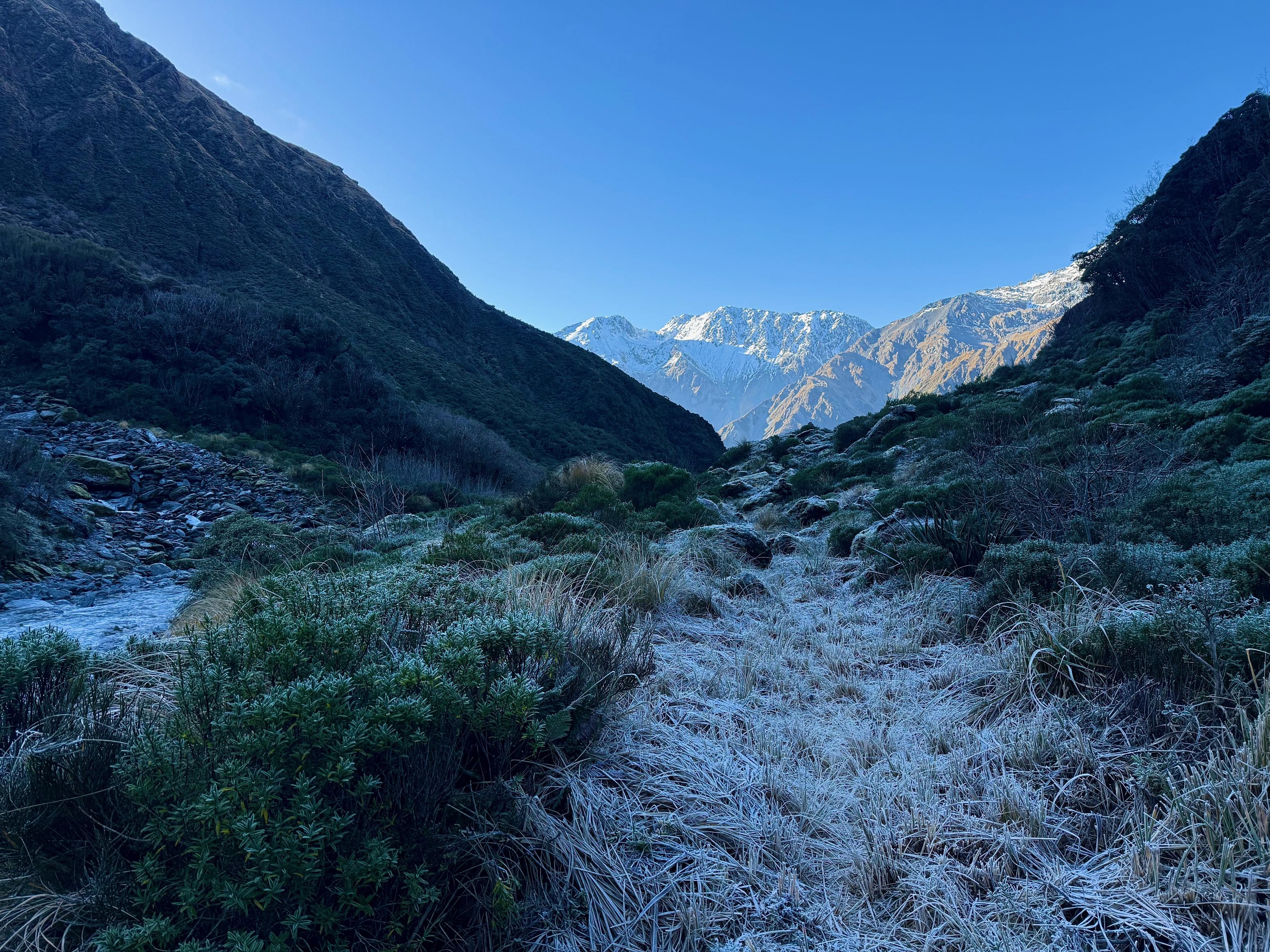 The frost came in hard overnight and everything was slippery and crunchy when we headed off around 10am. We had hoped that a later start would allow the sun to reach the valley, but in fact, we didnโt get into the sun until late in the afternoon! The route starts as a very well-formed and well-cut track before smashing any hopes of a good track into smithereens on the icy and slippery riverbed. Two fords of the Kokatahi occur within an hour of the hut (not including the one right by the hut), but neither proved challenging at normal flows.