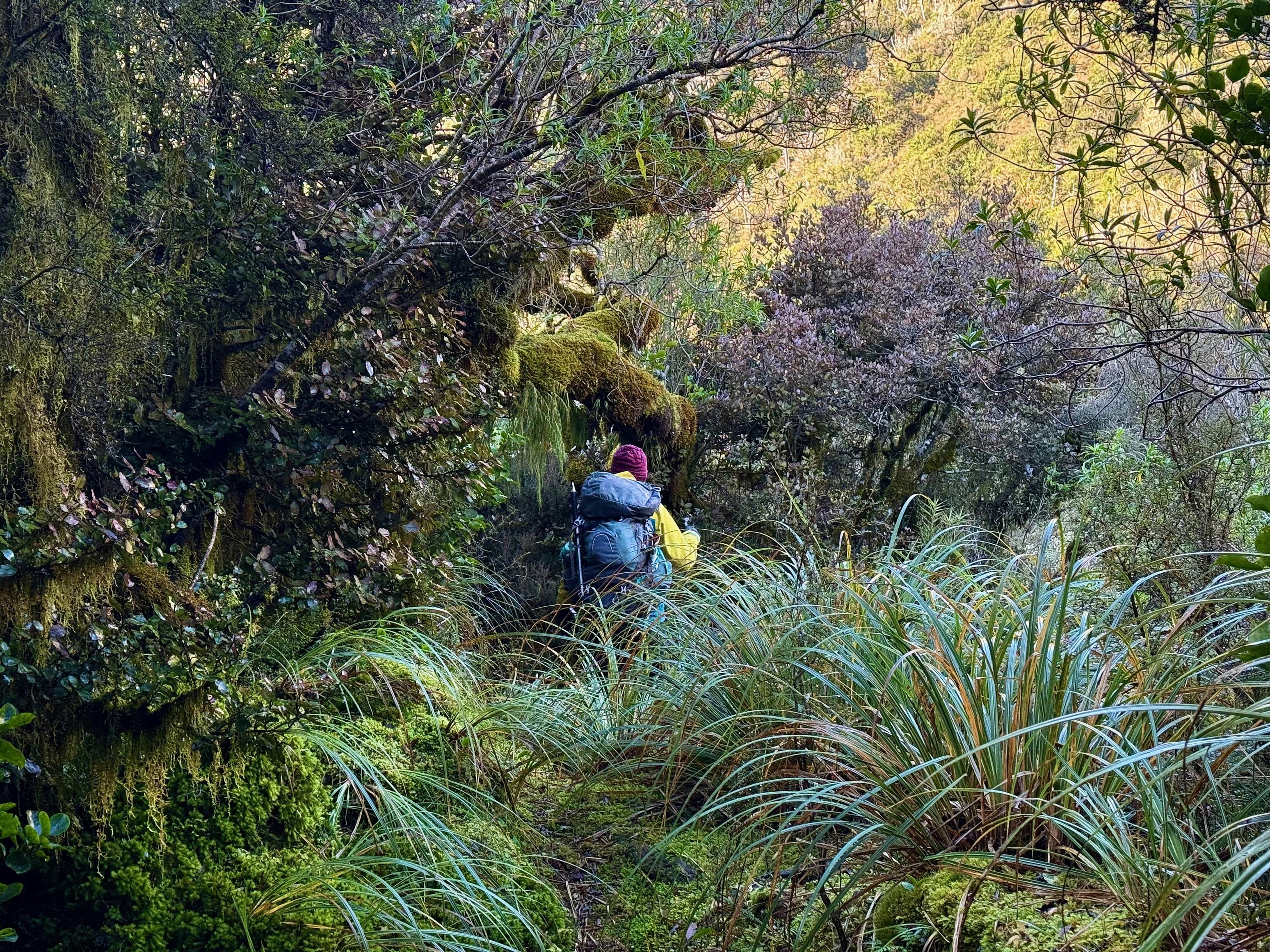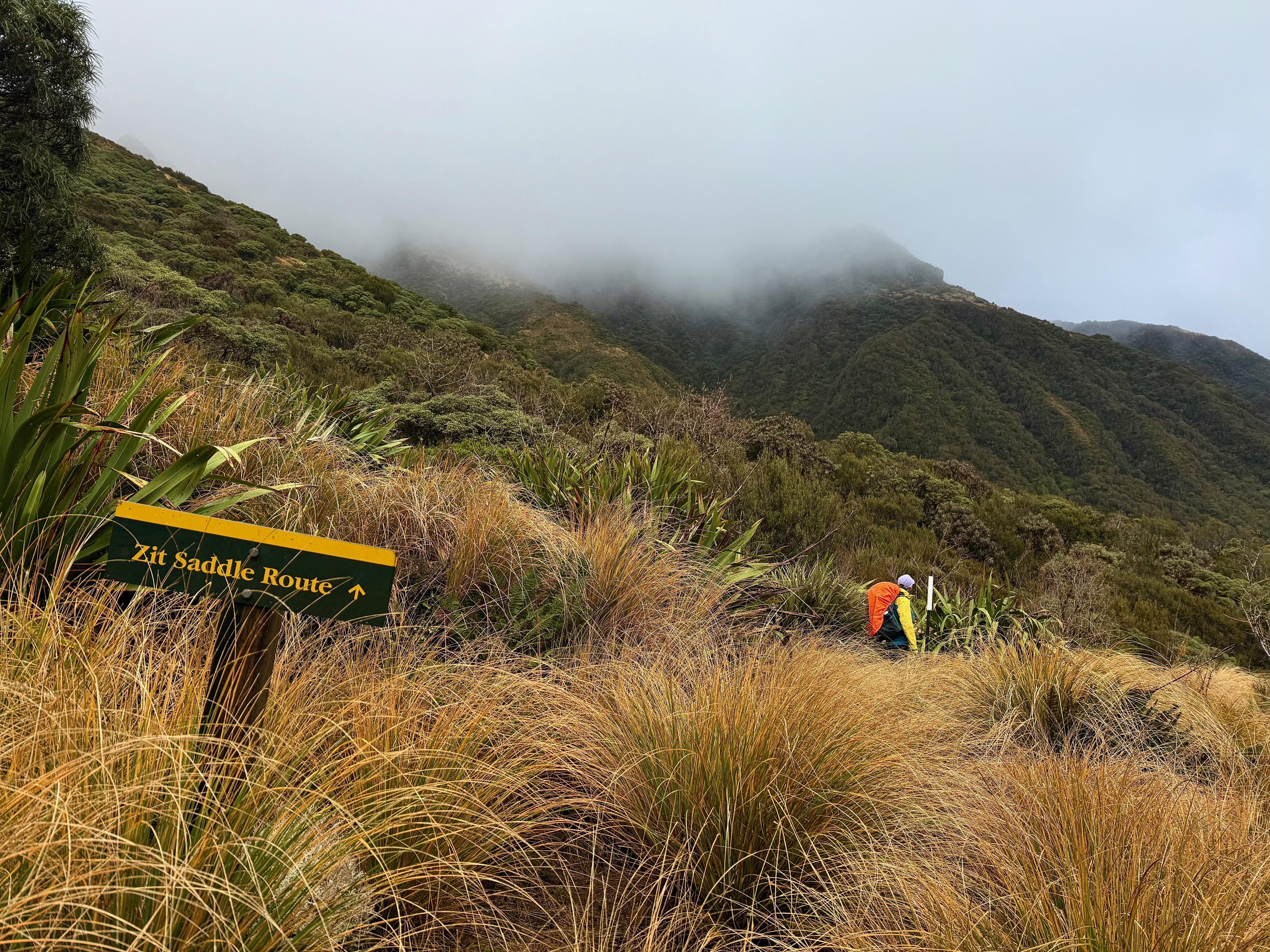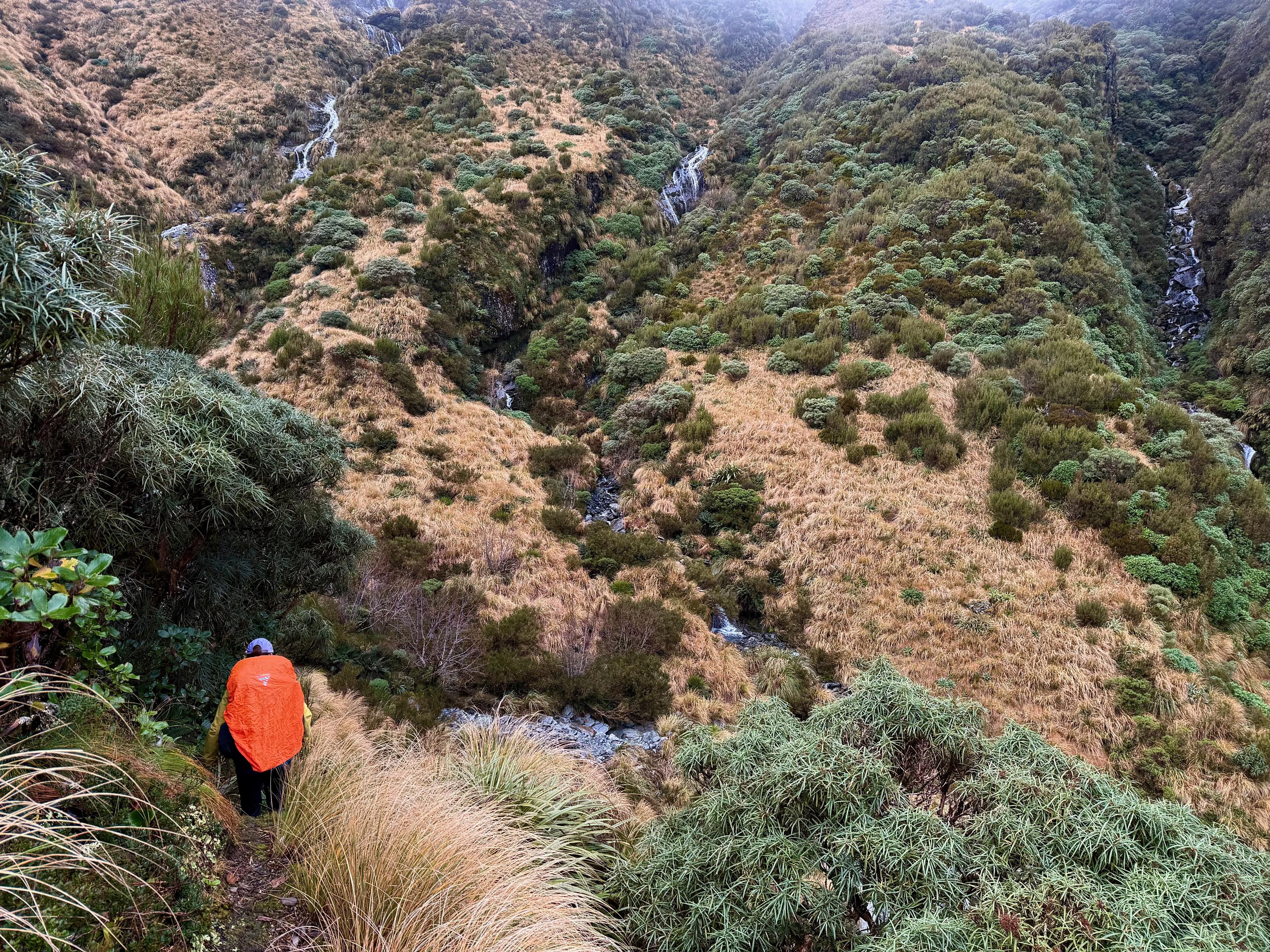 From Adventure Biv the track climbs steeply and can be quite indistinct and overgrown. There are markers aplenty, but that doesnโt mean it is obvious how to get to them. There is a very steep section up an erosion gully before you reach the open tussock. I imagine it would be easier if you were 12ft tall with legs of a giant!