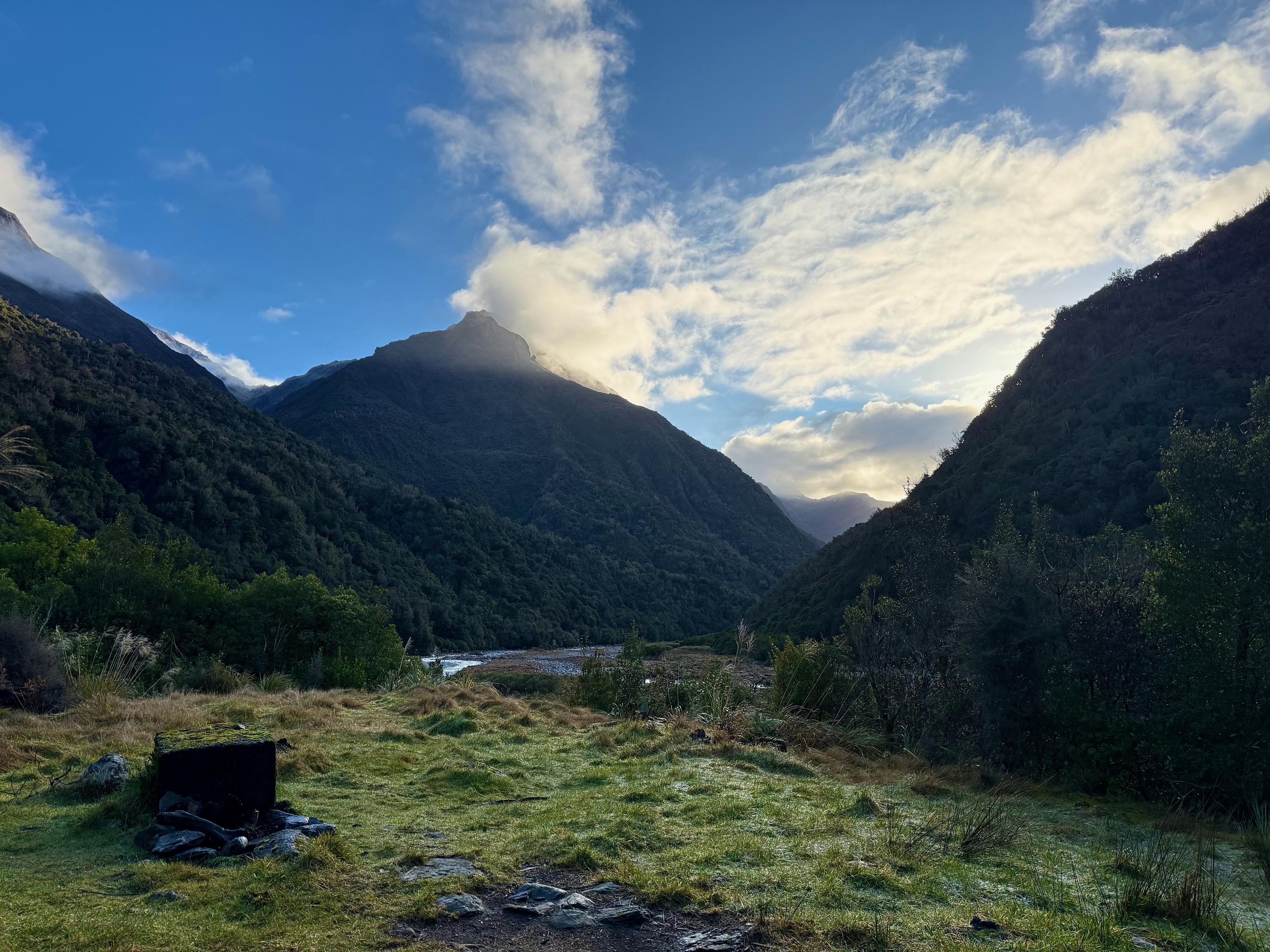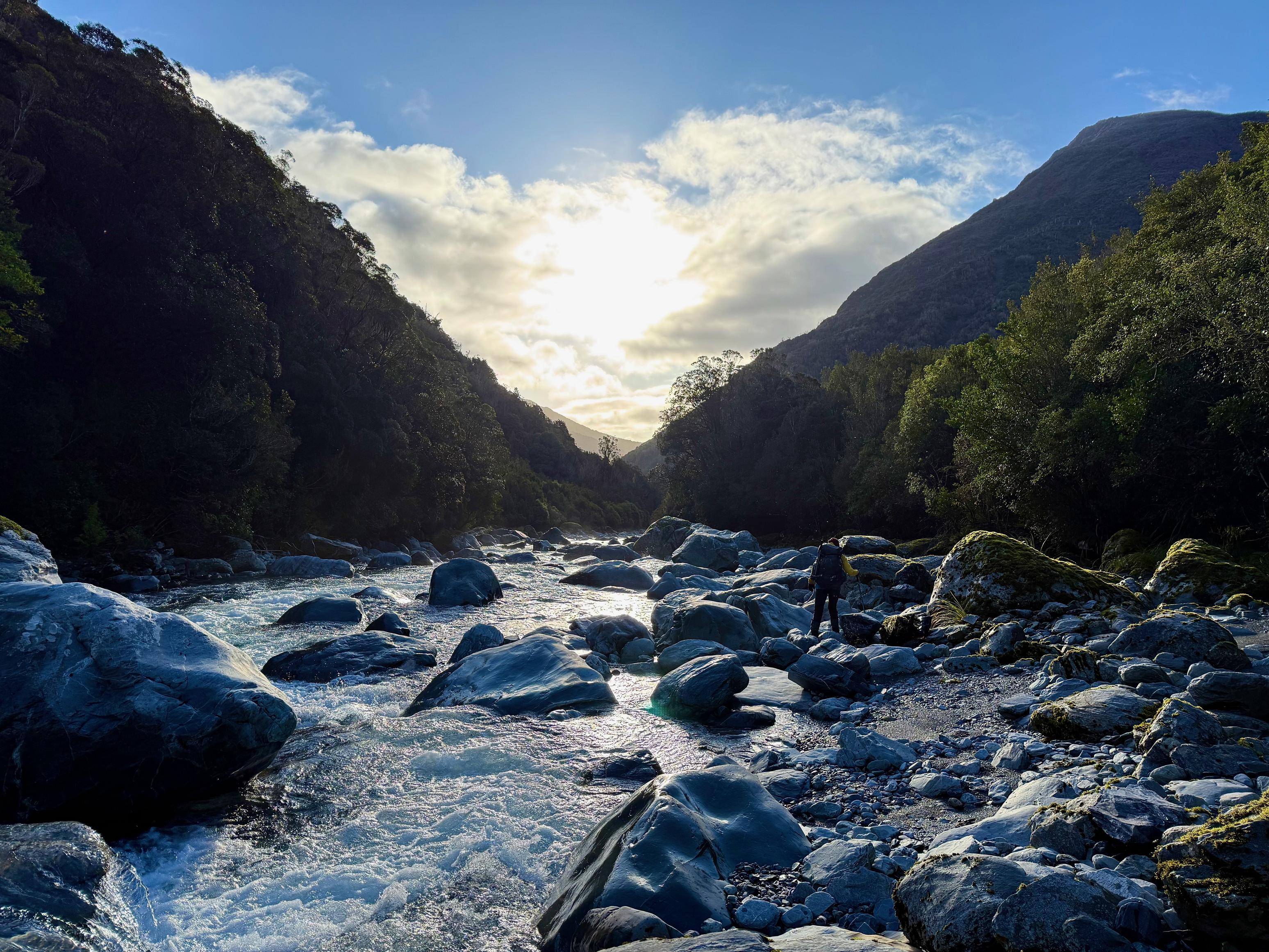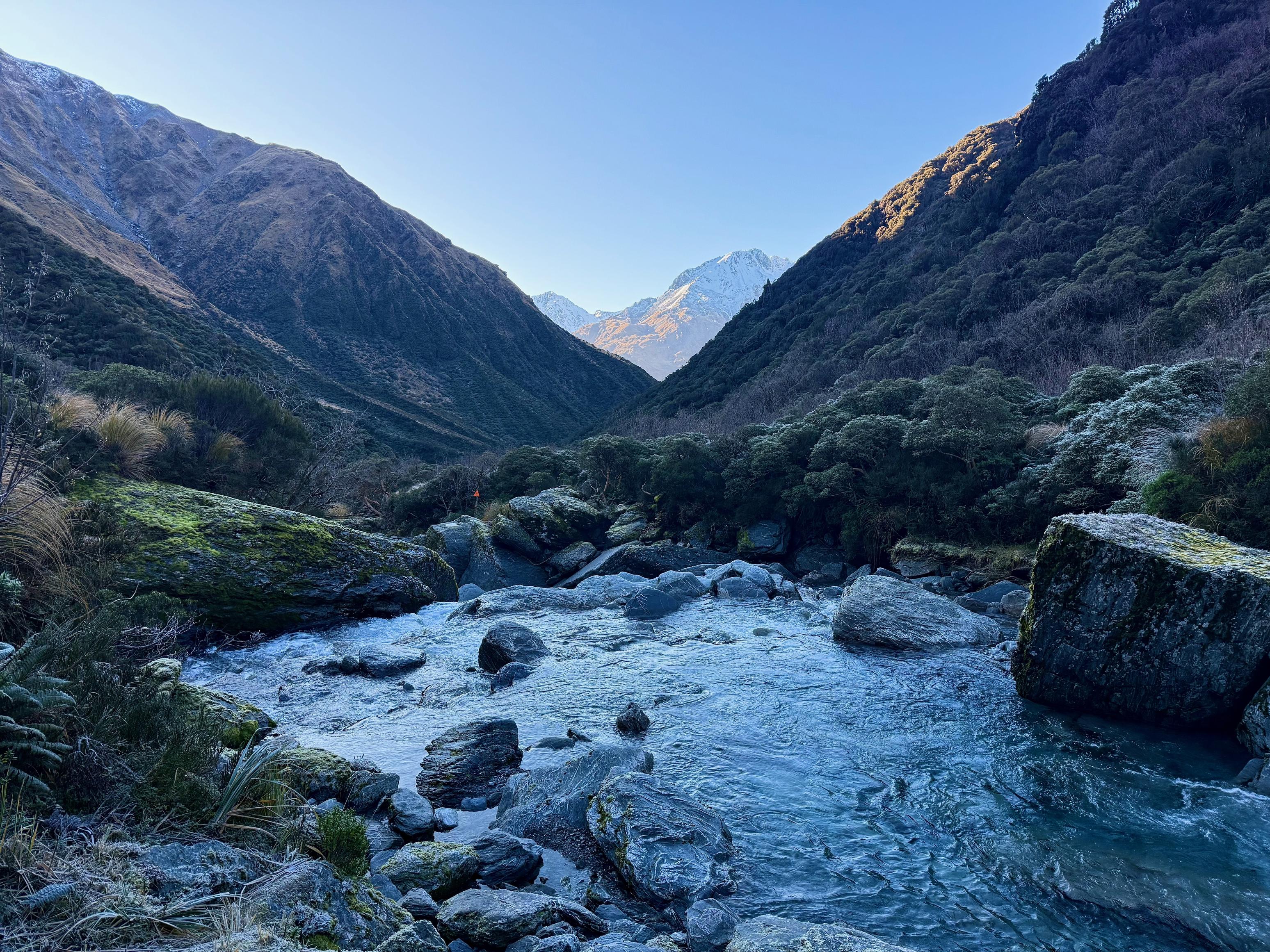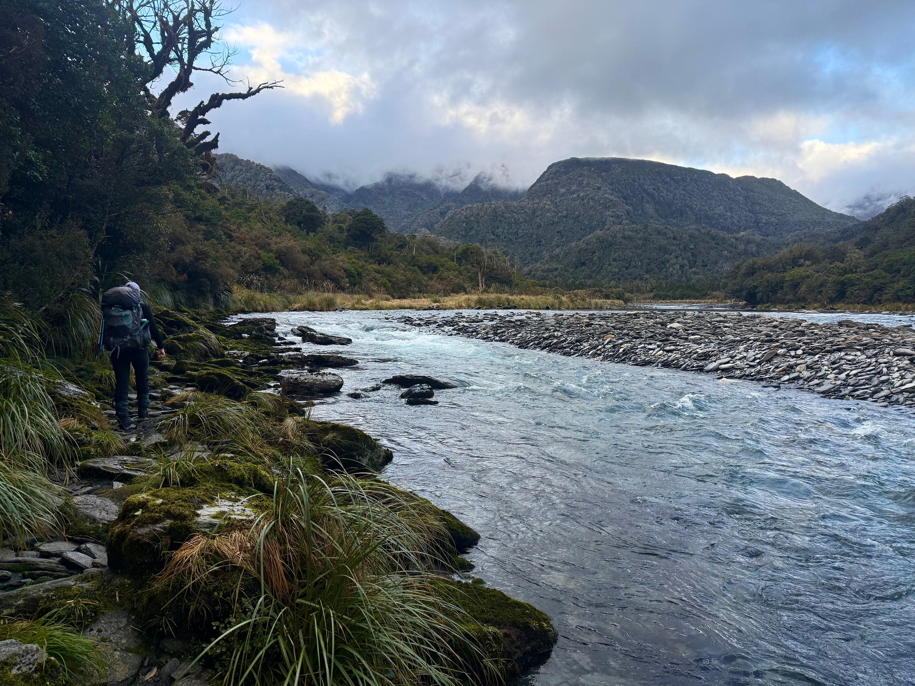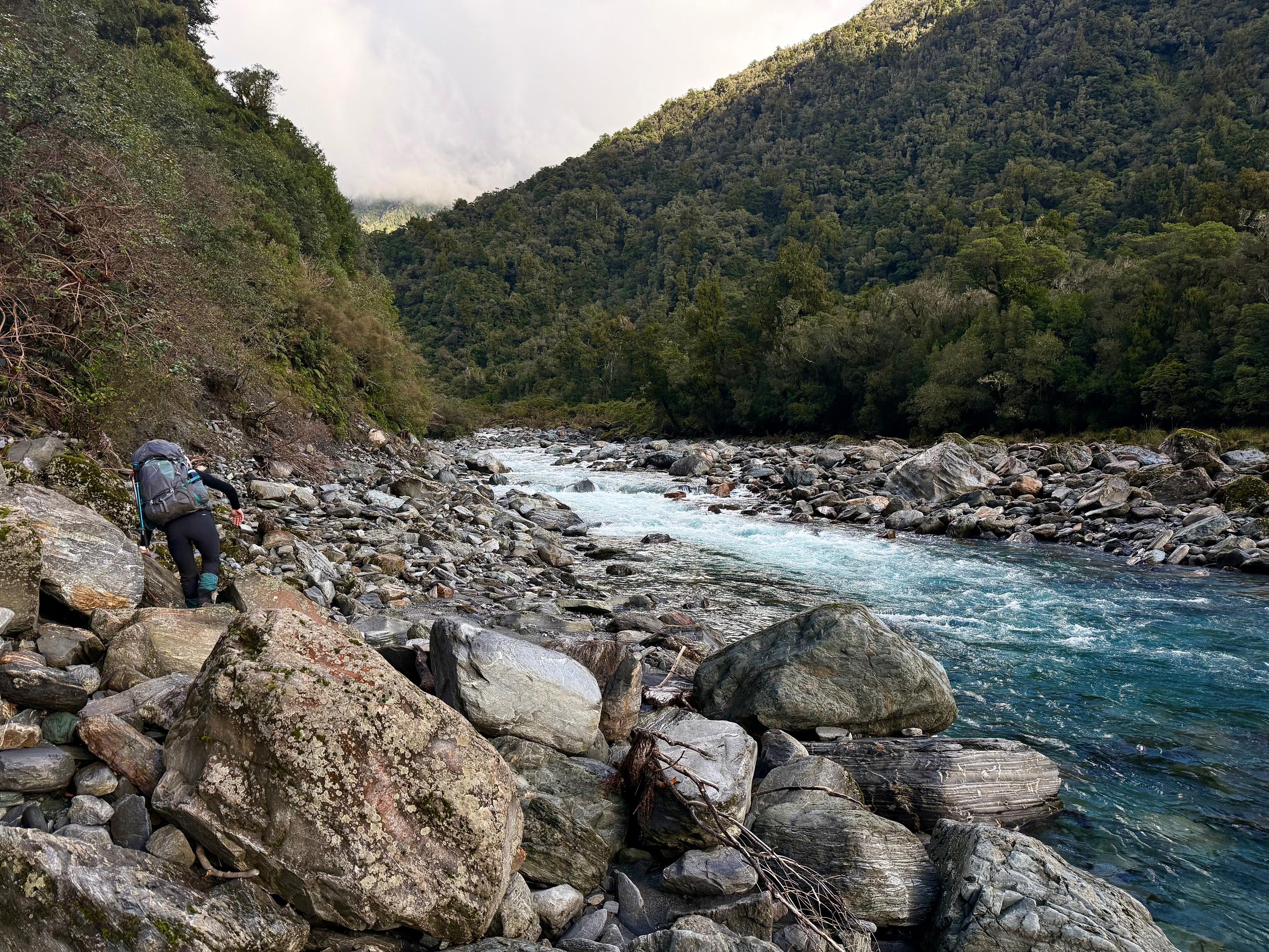 We began by crossing the Crawford and ambling down the true right of the Kokatahi to cross just above the Blue Duck Creek confluence (as described on Remote Hut). We ended up going too far and the river looked too deep, so we backtracked a little and crossed at a wider spot. There was an even better spot further upstream if you didnโt want wet undies on a frosty morning ๐ฅถ