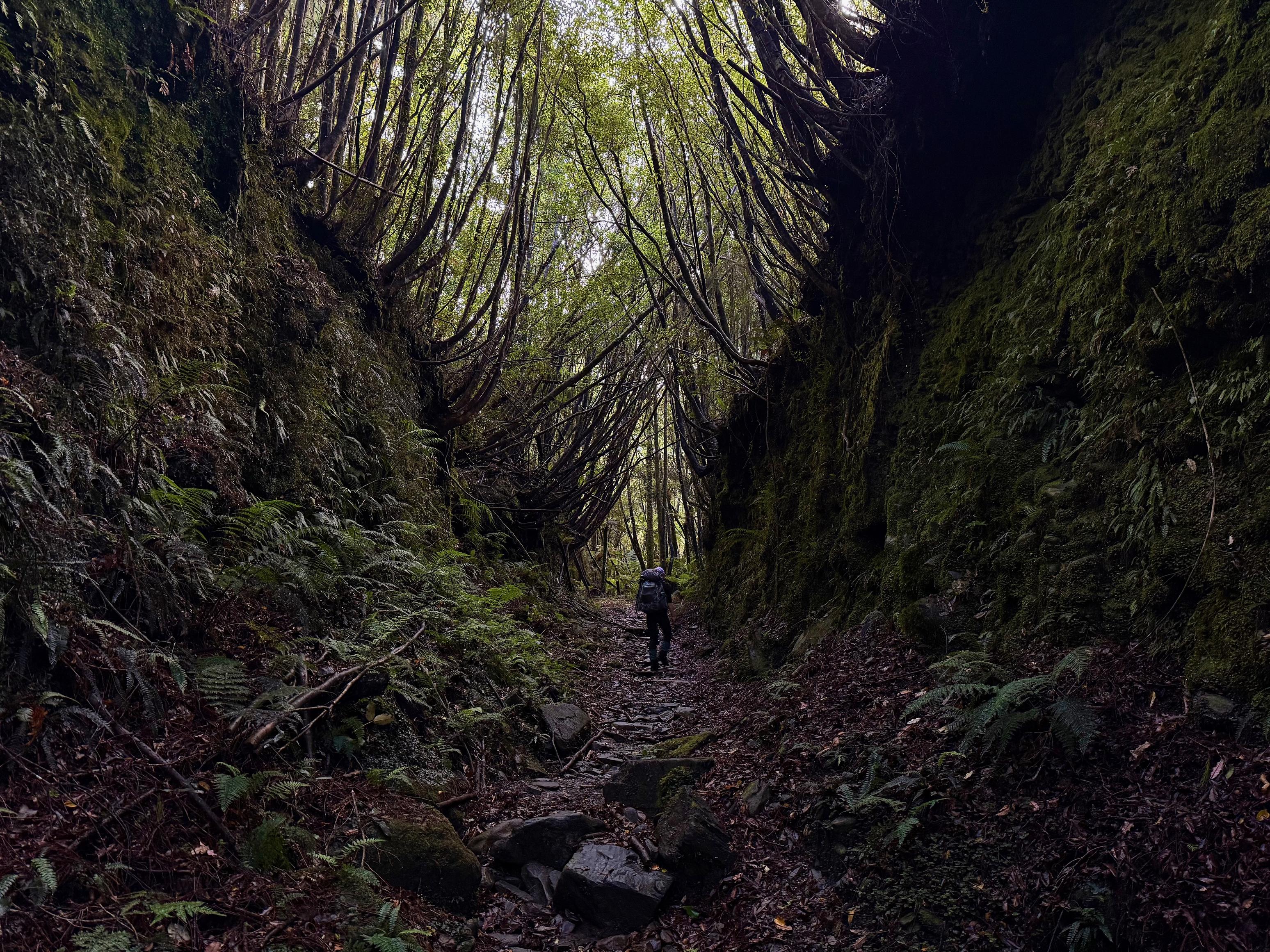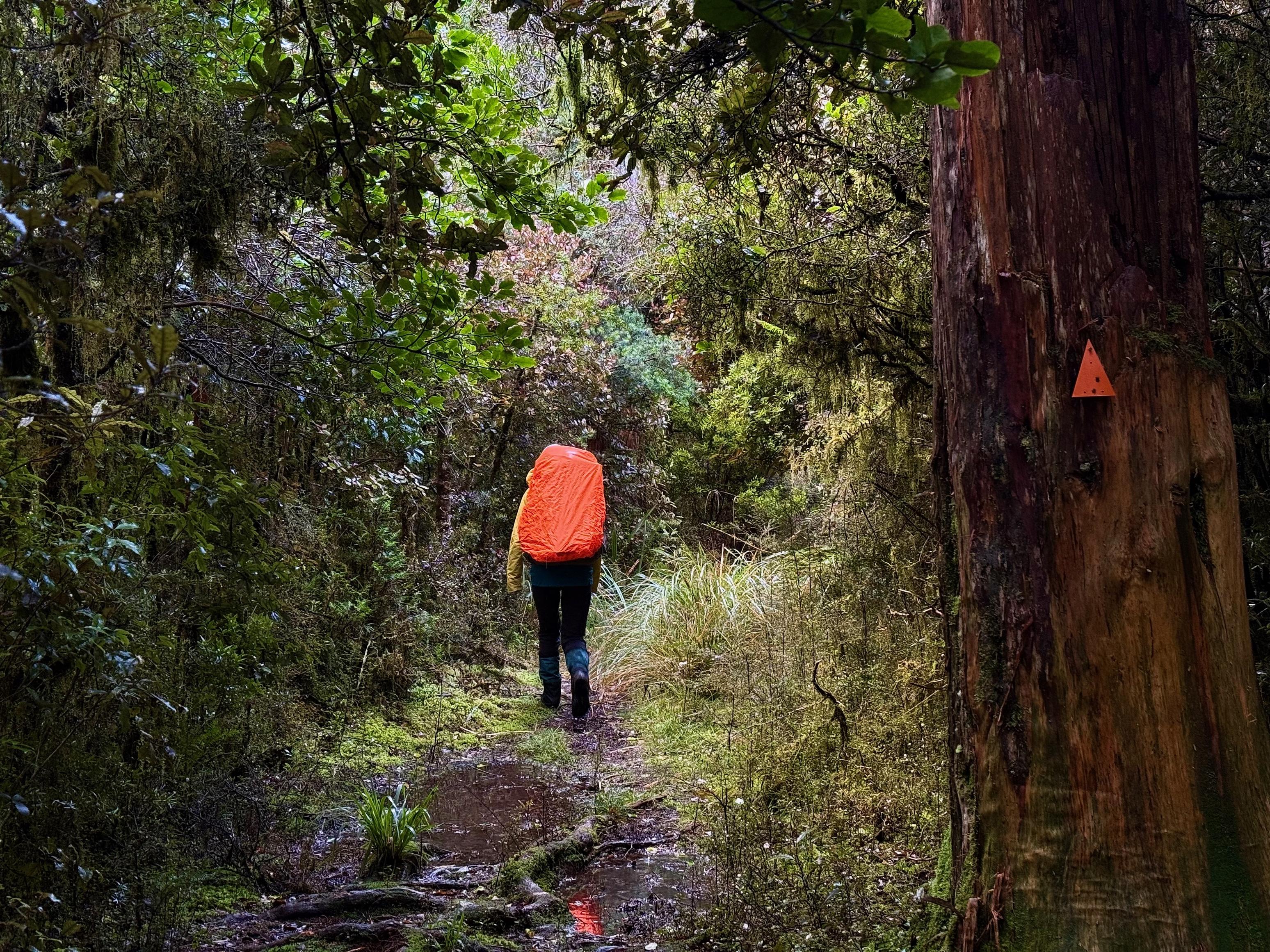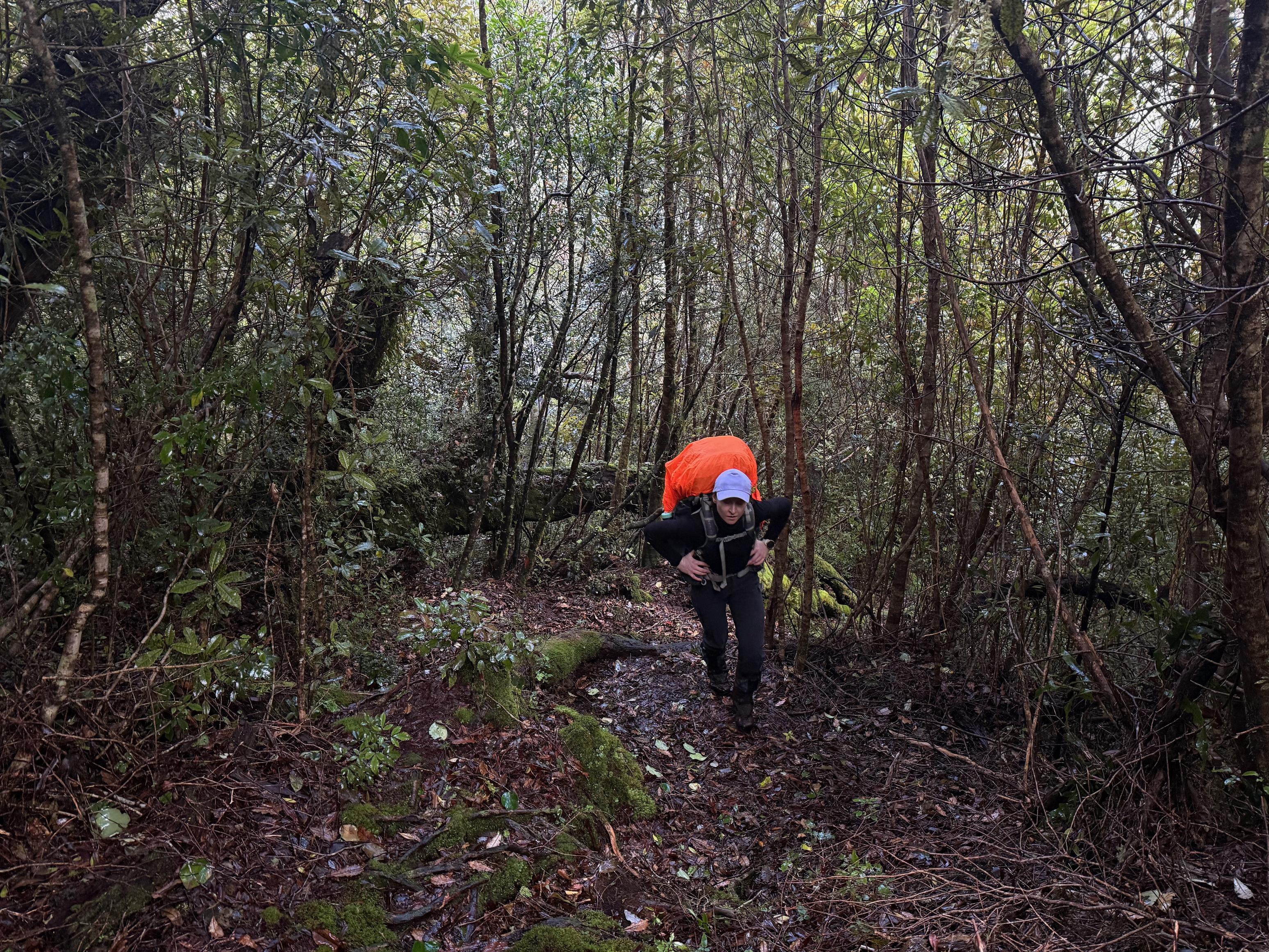 During the night the rain came early, drat! This meant by the time that we woke the track and forest was sodden. Thankfully, there wasn’t much in terms of river crossings that could stop us. All we had to do was walk downhill in the rain, that’s not so hard!