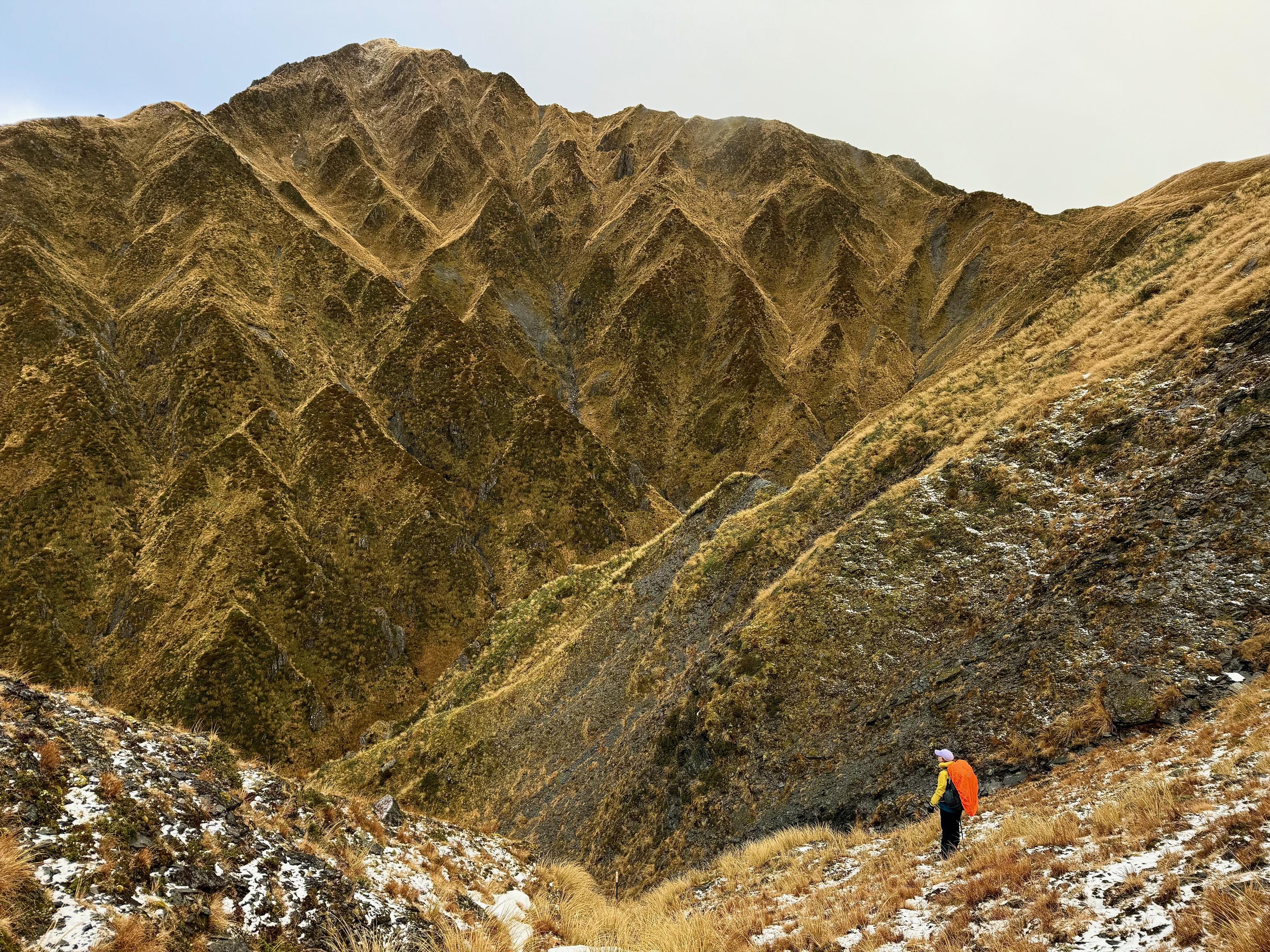 We were also graced with the presence of a couple of kea as we neared the ridge. I didnโt managed to get a photo of either of them flying, alas. Interestingly the east aspect of Zit Saddle had a good deal more snow, but thankfully the terrain was much less steep. I even got to do a small glissade!