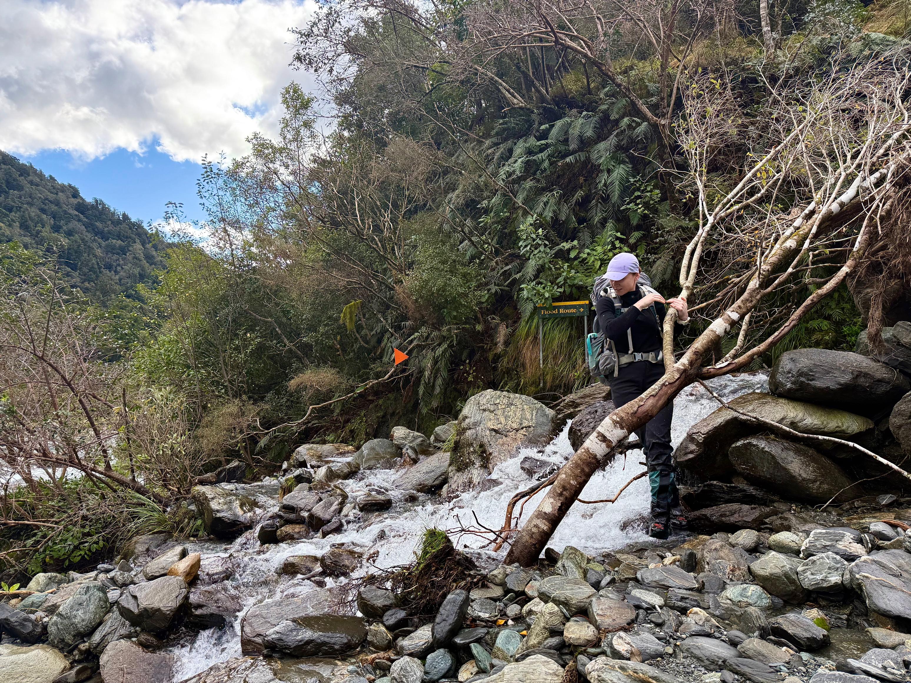 Our morale was a bit low (read: very) as we made our way down the valley, but we were buoyed by passing the sign to Clarkeโs Pass. This told us we werenโt too far from the cableway! Wahoo. The track generally continues to improve as you get closer to the cableway, too. We did, however, miss a triangle (Iโm convinced it was missing) for a re-entry to the bush and got stuck on the riverbed. We ended up bashing through a little bit of bush to find the track we were certain was there.