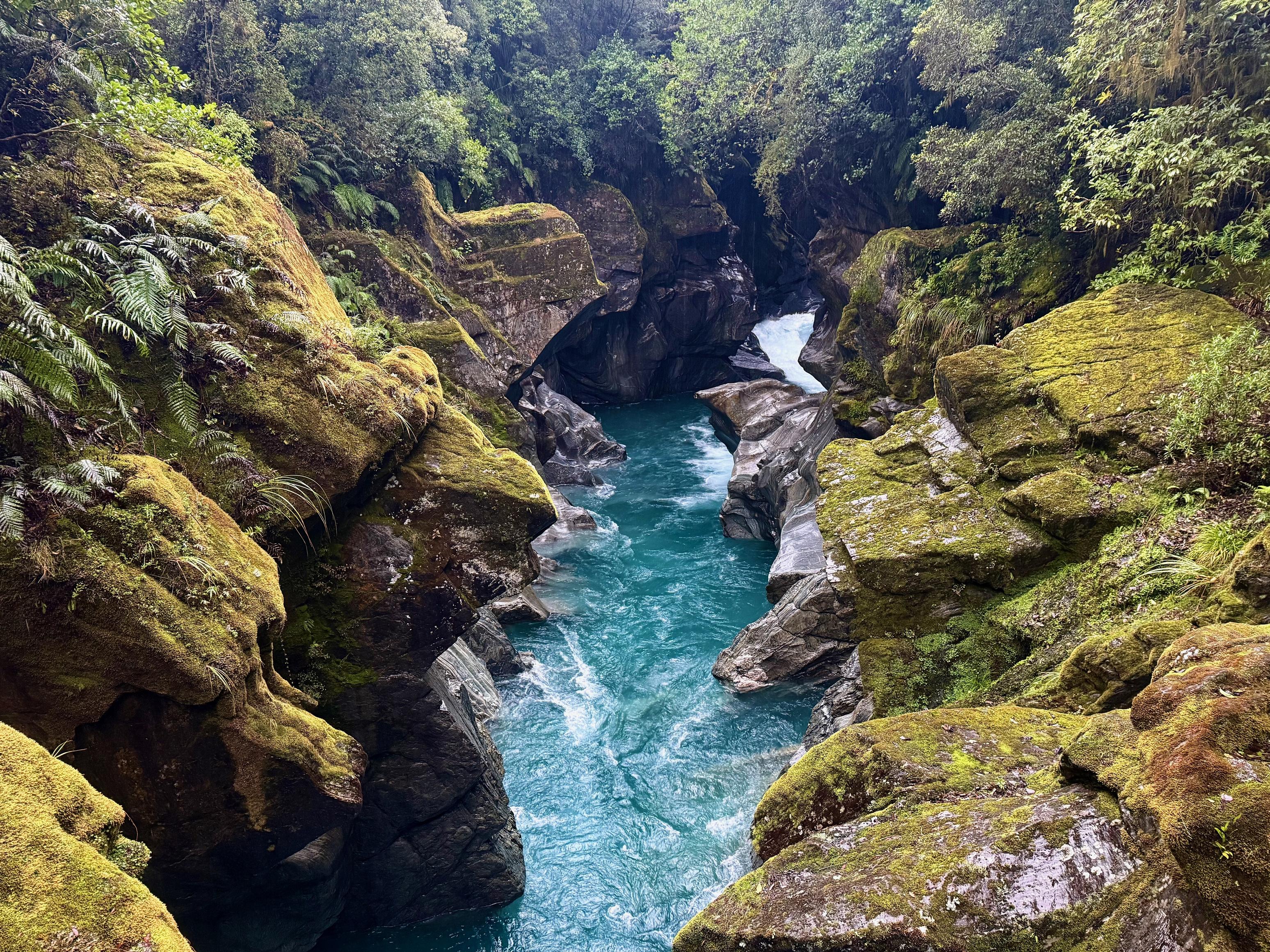 The track, for the most part, was very straightforward. It was well-formed and well-marked, but there were many slippery rocks and unstable steps due to water-soaked ground. Still, easily passable and we made good time down the hill and across the couple of creeks. We reached the bridge across the stunning Whakarira Gorge in just under two hours. Wowee, that is one nice gorge.