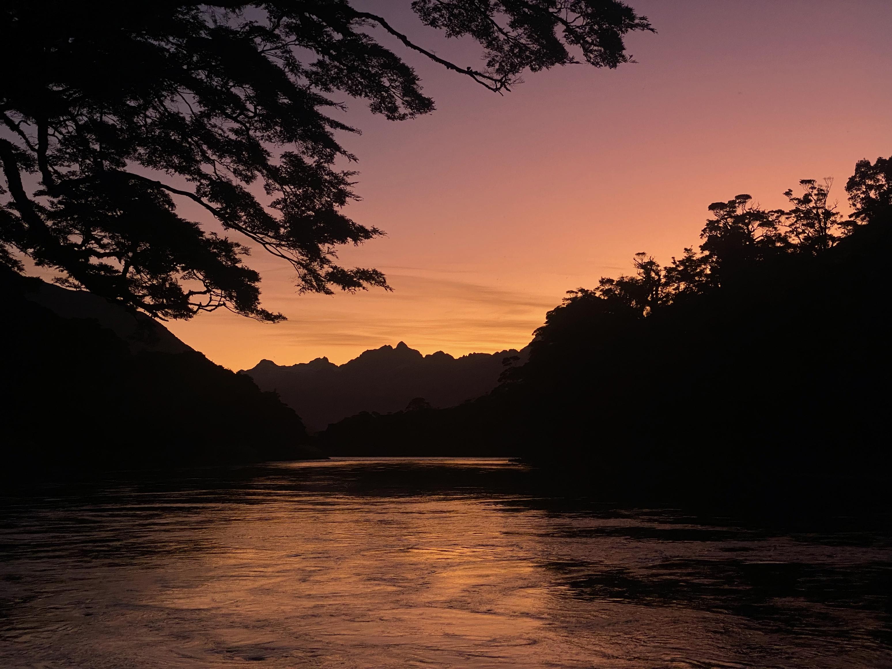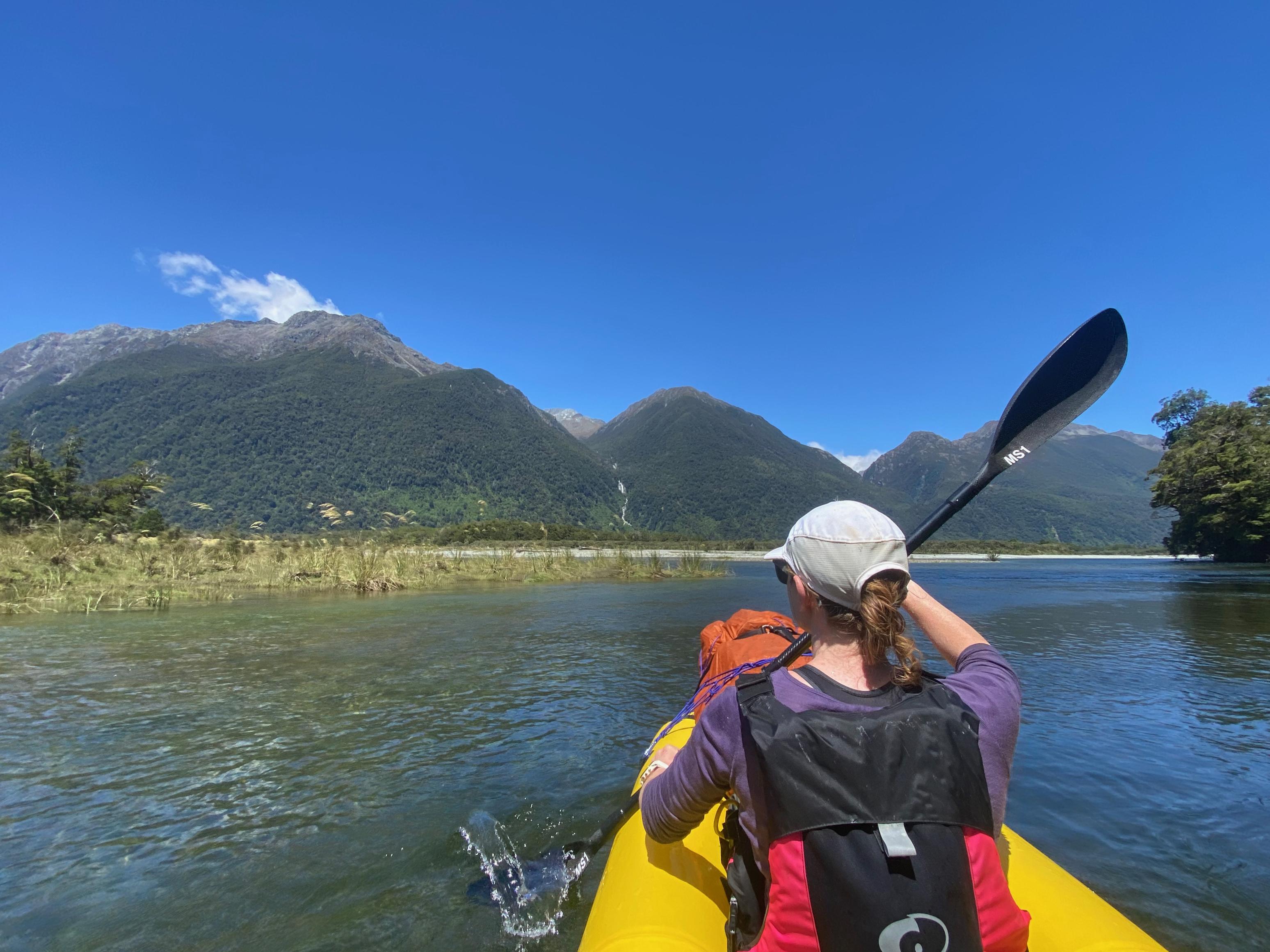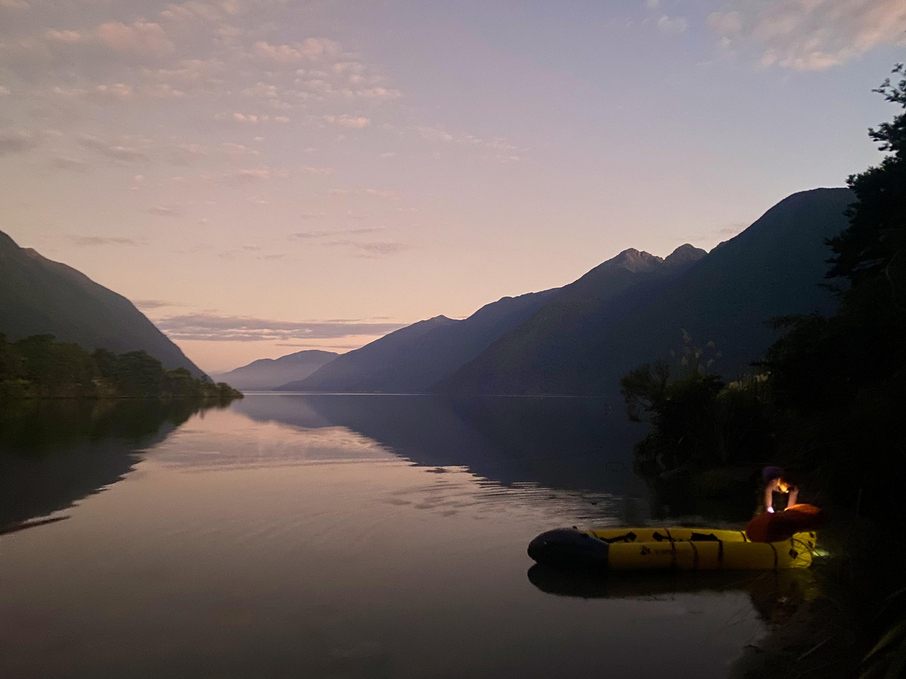 We started the day with a 4:10am wake-up call, followed by coffee and avo on bread (you can pack nice food when you don’t have to carry it!). We worked around a guided party of eight who were doing the same loop and were on the water at 5:30am. The weather was perfect, with even a slight tailwind helping us across Whakatipu Waitai (Lake McKerrow). We originally planned to paddle near the side of the lake for safety, but the conditions were so nice we just headed straight up the middle.