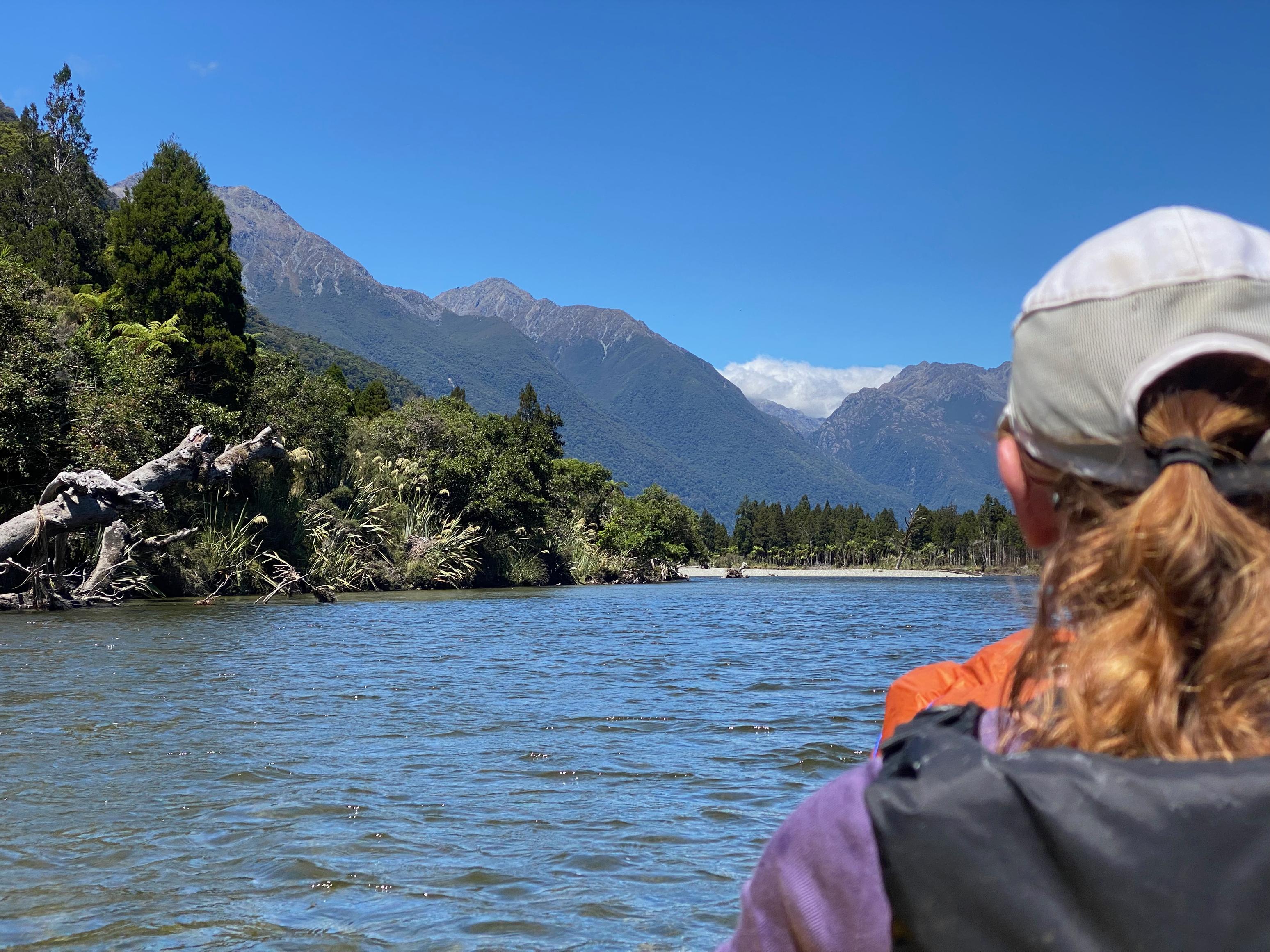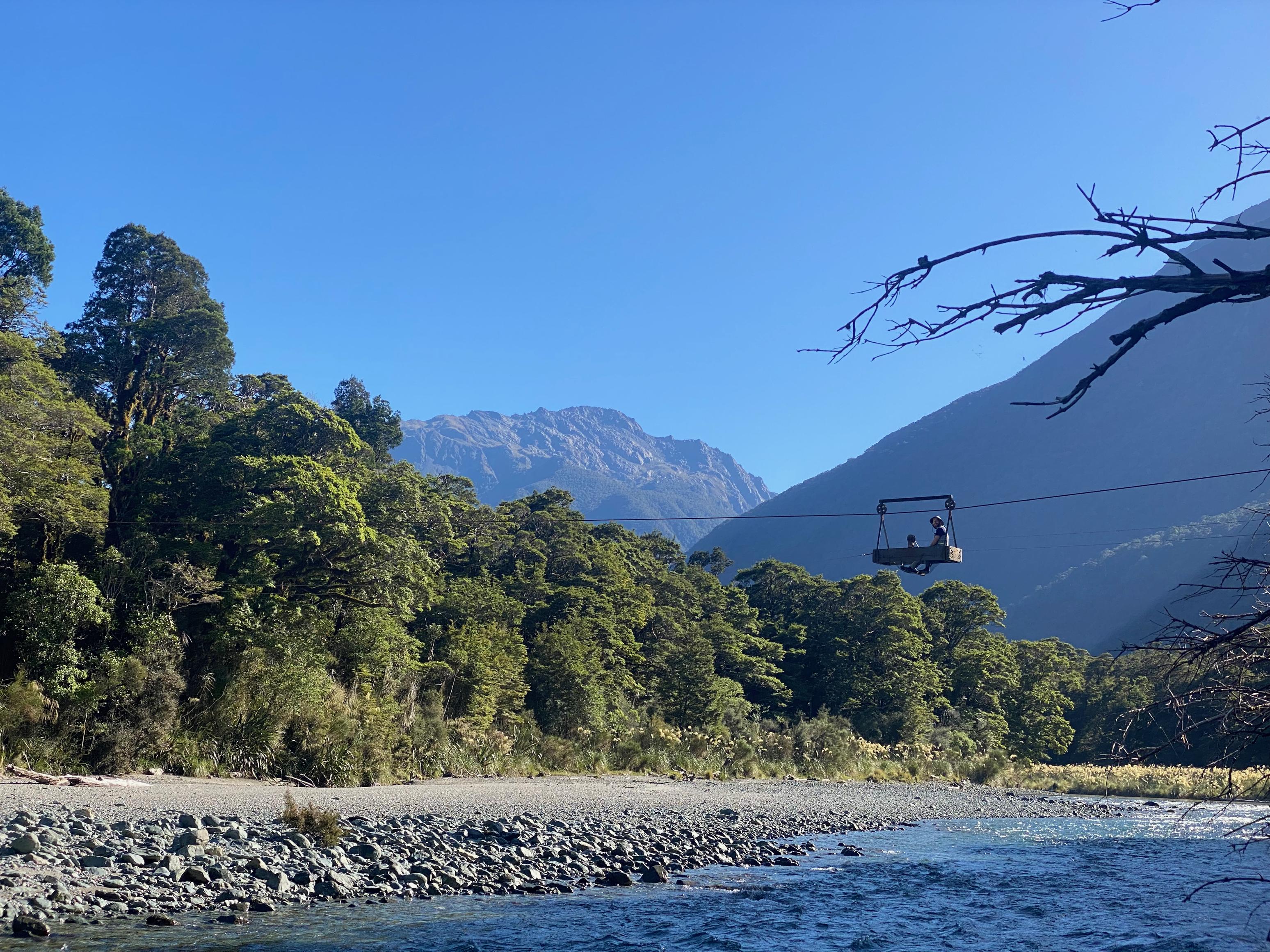 We knew we had a short day today so we had a nice relaxed start again. I got on the cableway over Olivine River - amazing fun. So slow, though! The sun was out again and blazingly hot. I didn’t wear my paddle jacket it was so warm. We cruised down the Pyke with Mt Madeline and others in the distance providing a stunning view.