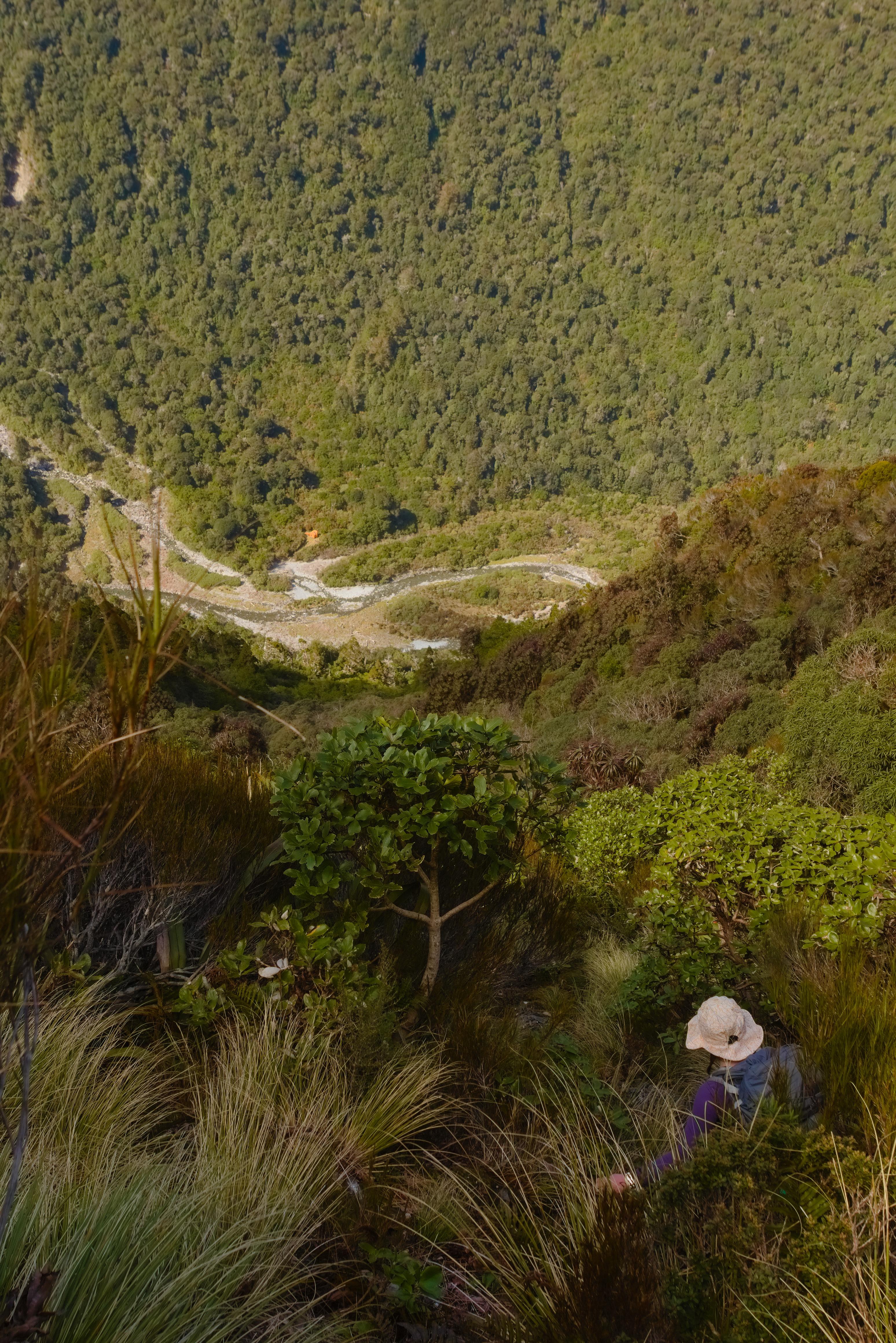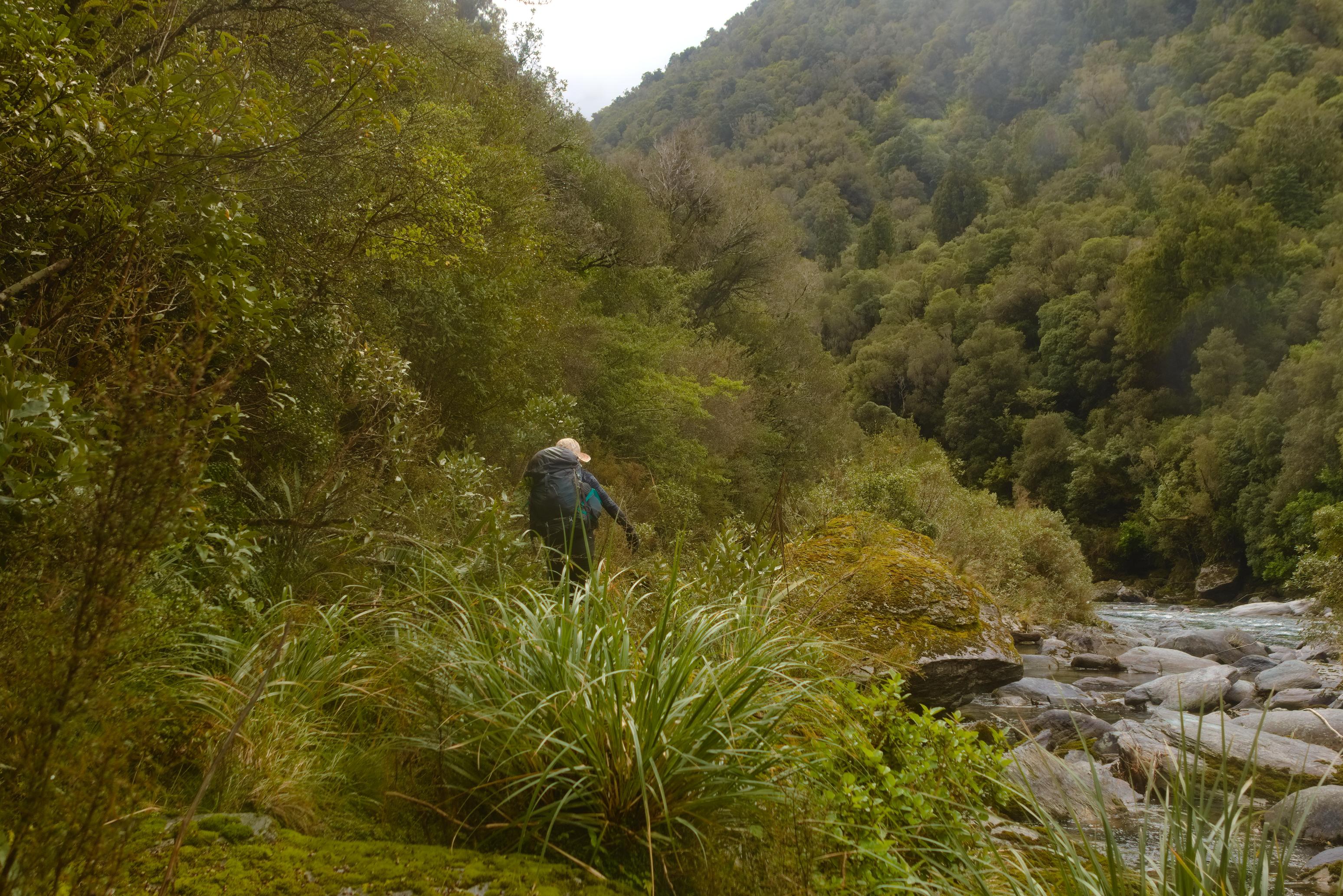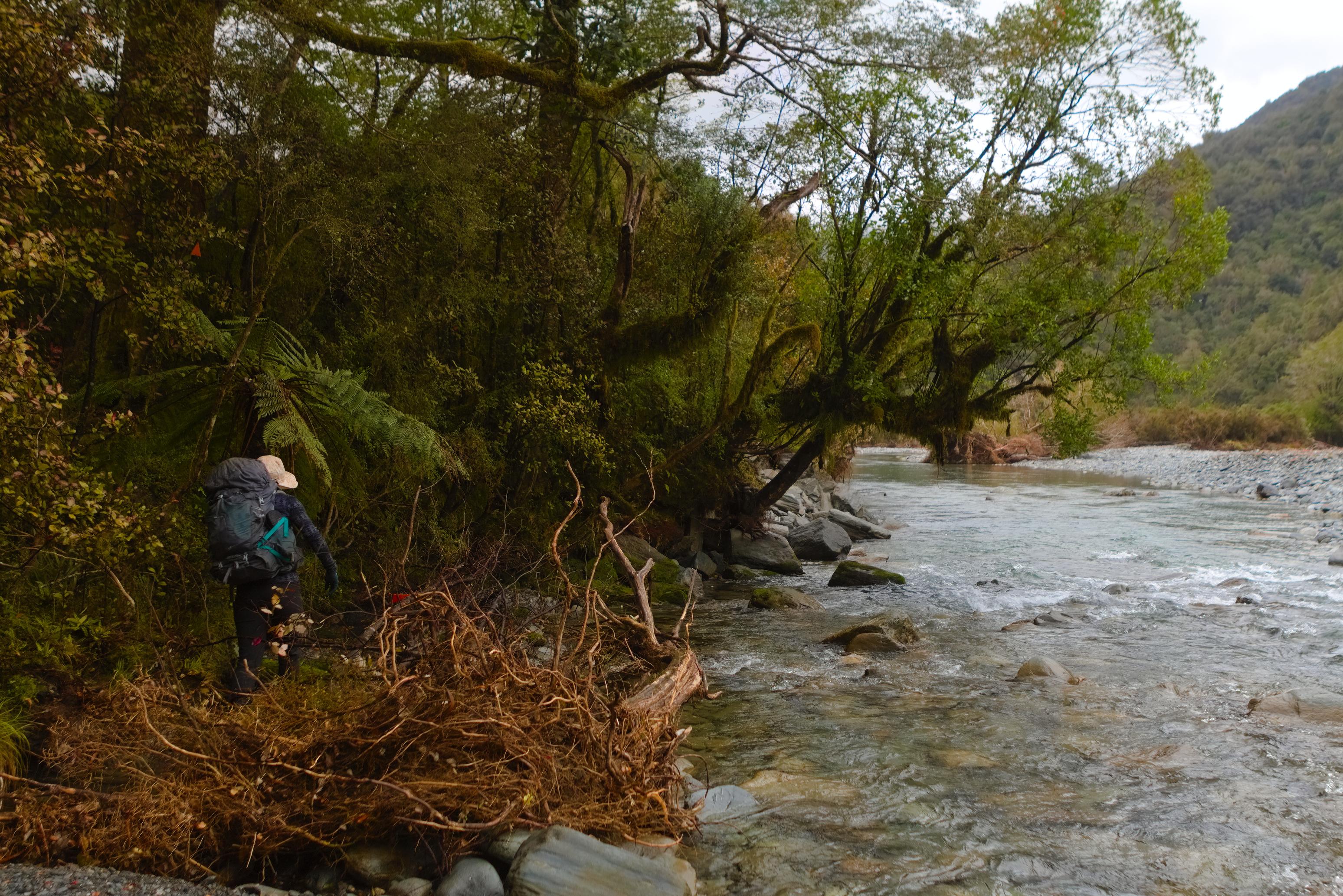 The track moves into the shrubs soon enough and orange triangles are plentiful - although you would really have to try to get off βchuteβ. Clamber slowly and carefully down the well trimmed track to reach Crooked River. Jen found facing into the hill and climbing that way very efficient, while Finn faced out to the valley, moved slower, and did a lot of swearing at slippery rocks and loose ground.