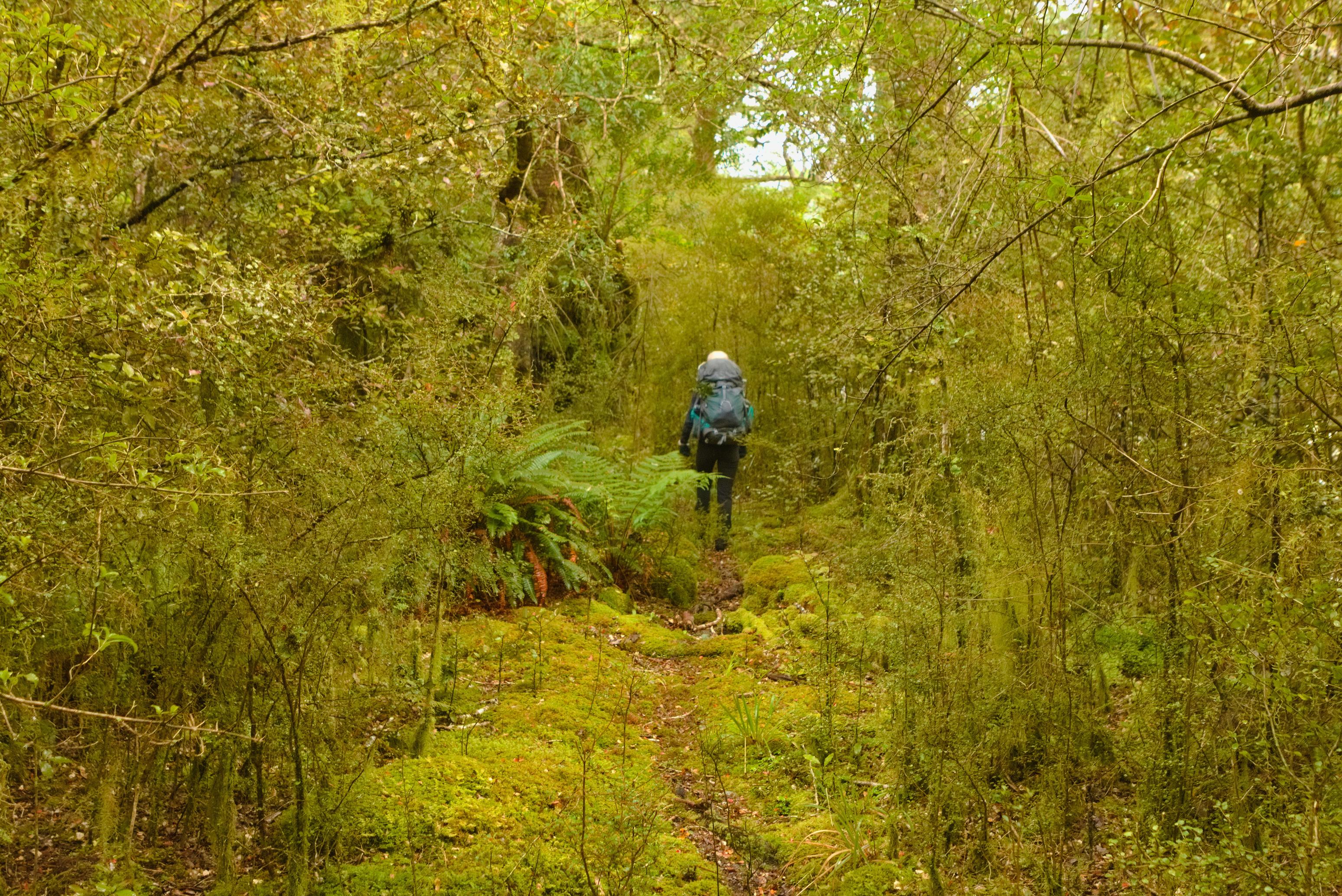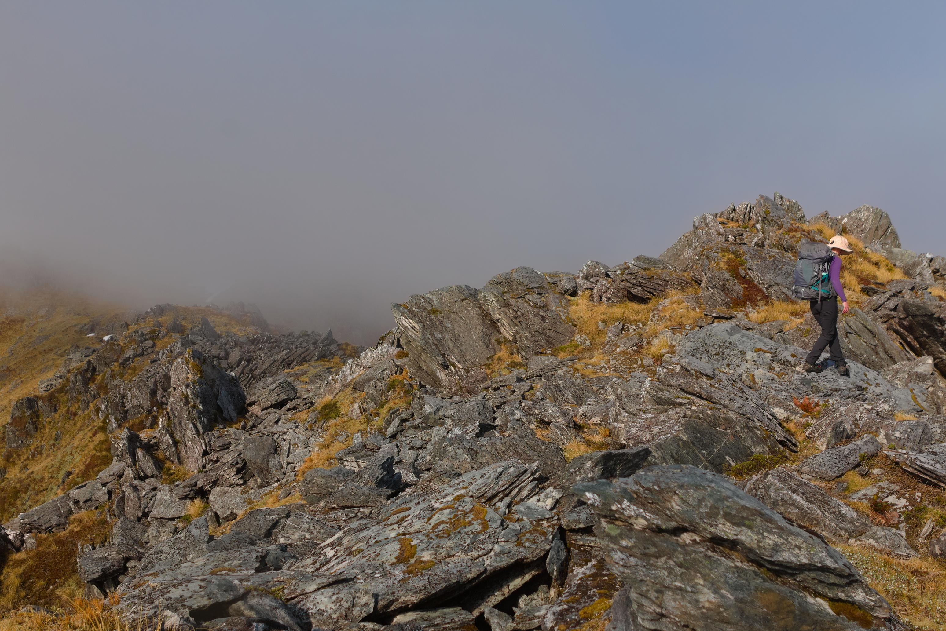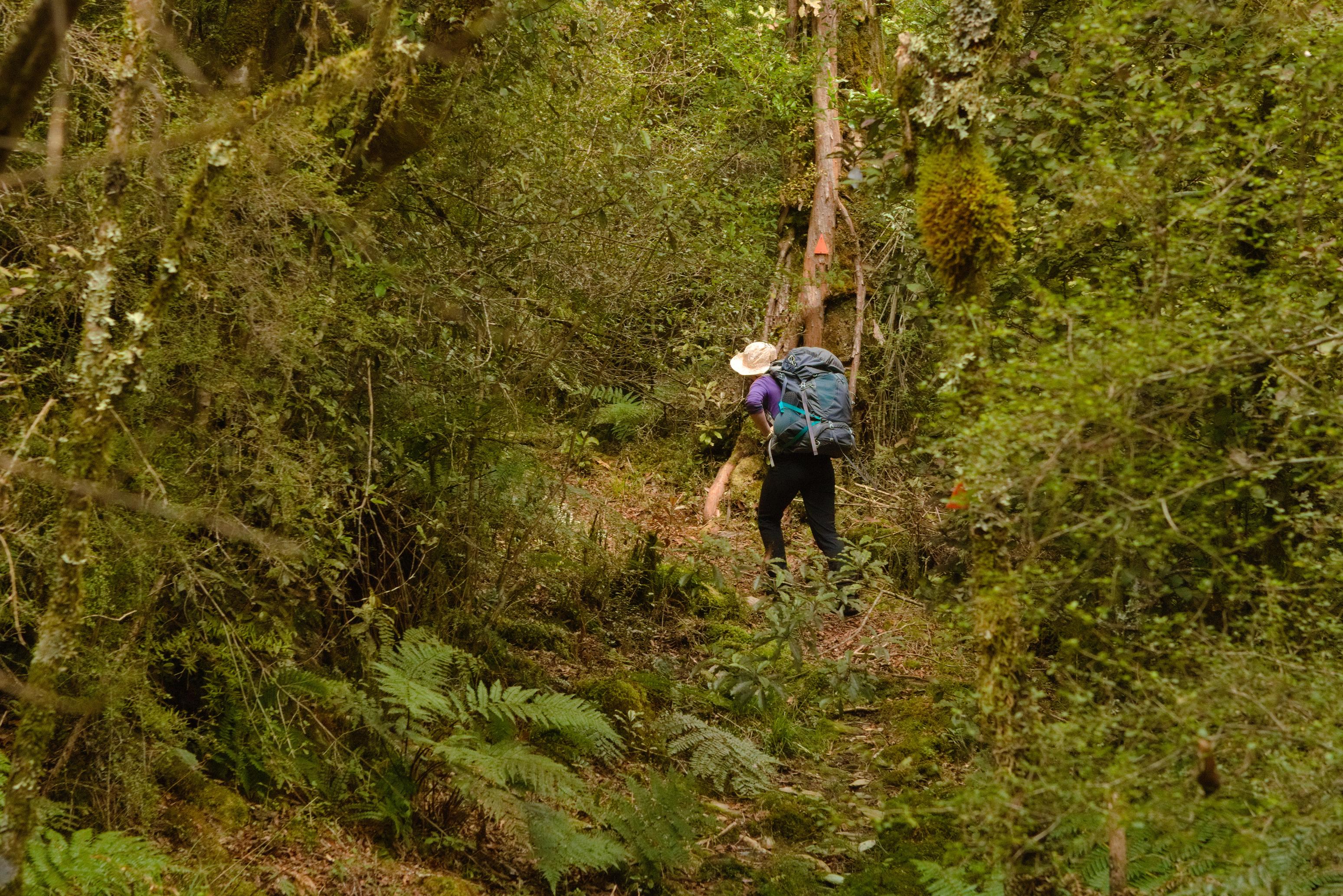 The track moves into the shrubs soon enough and orange triangles are plentiful - although you would really have to try to get off βchuteβ. Clamber slowly and carefully down the well trimmed track to reach Crooked River. Jen found facing into the hill and climbing that way very efficient, while Finn faced out to the valley, moved slower, and did a lot of swearing at slippery rocks and loose ground.
