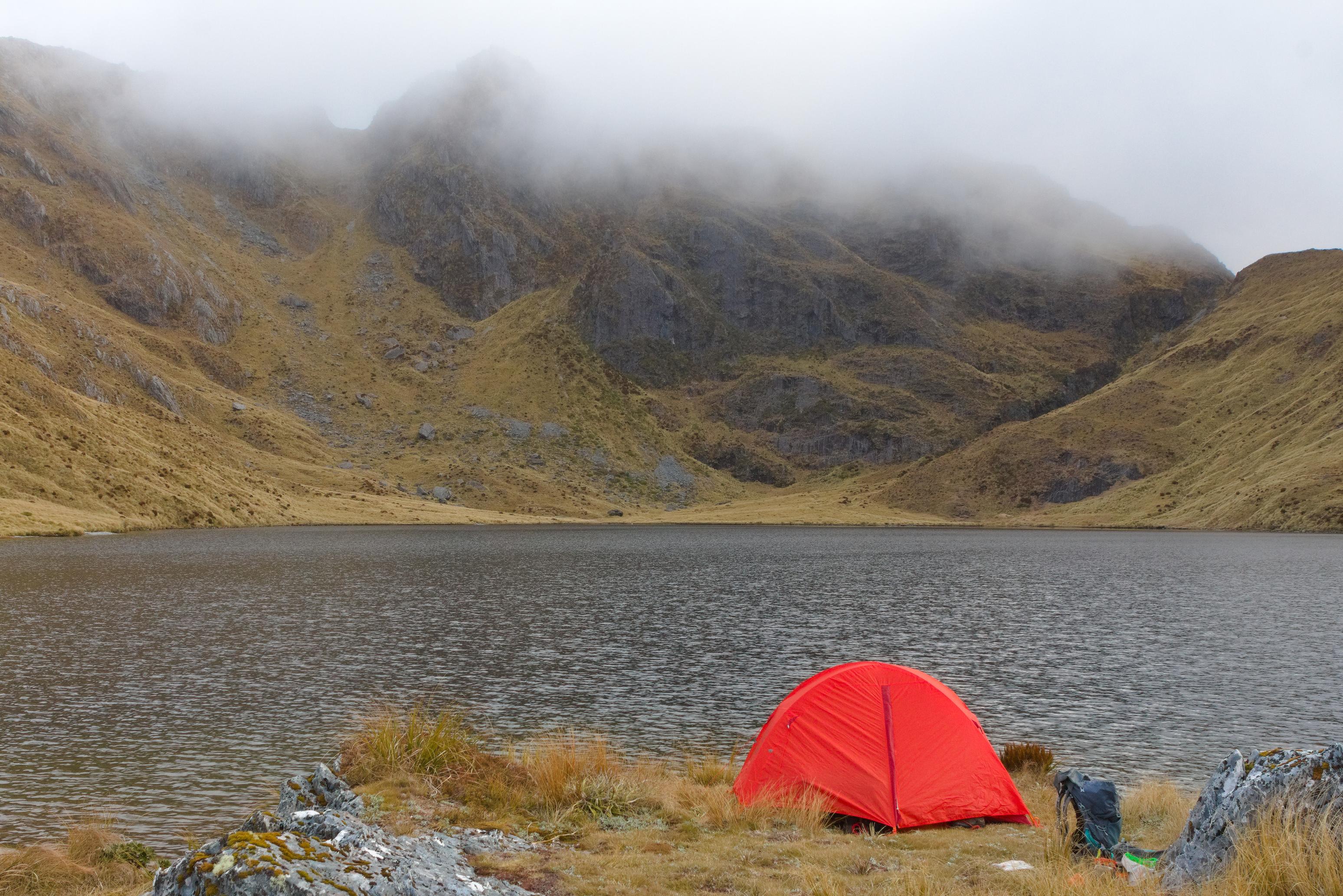 The descent from OβShanessy down its south spur is steep and would require care in wet/snowy conditions. The gradient eventually eases off and you soon find the hut. We had bumped into a party of 4 headed to stay at the hut so stopped in for a cup of tea before heading up to Lake Morgan proper to camp. We found a suitable site for two at the north end on a tiny wee peninsula.