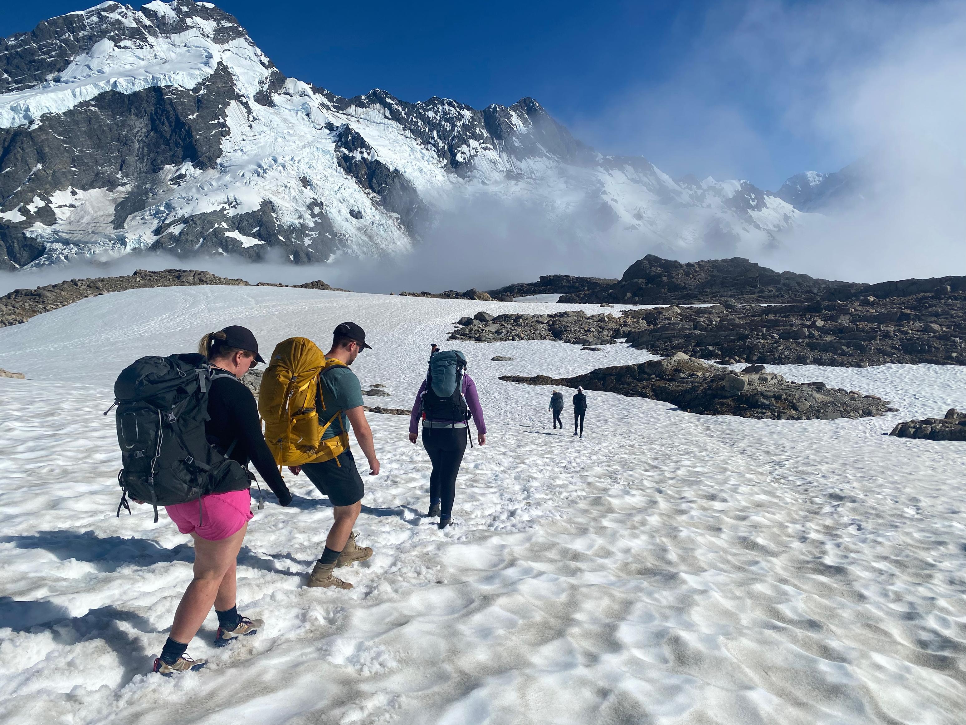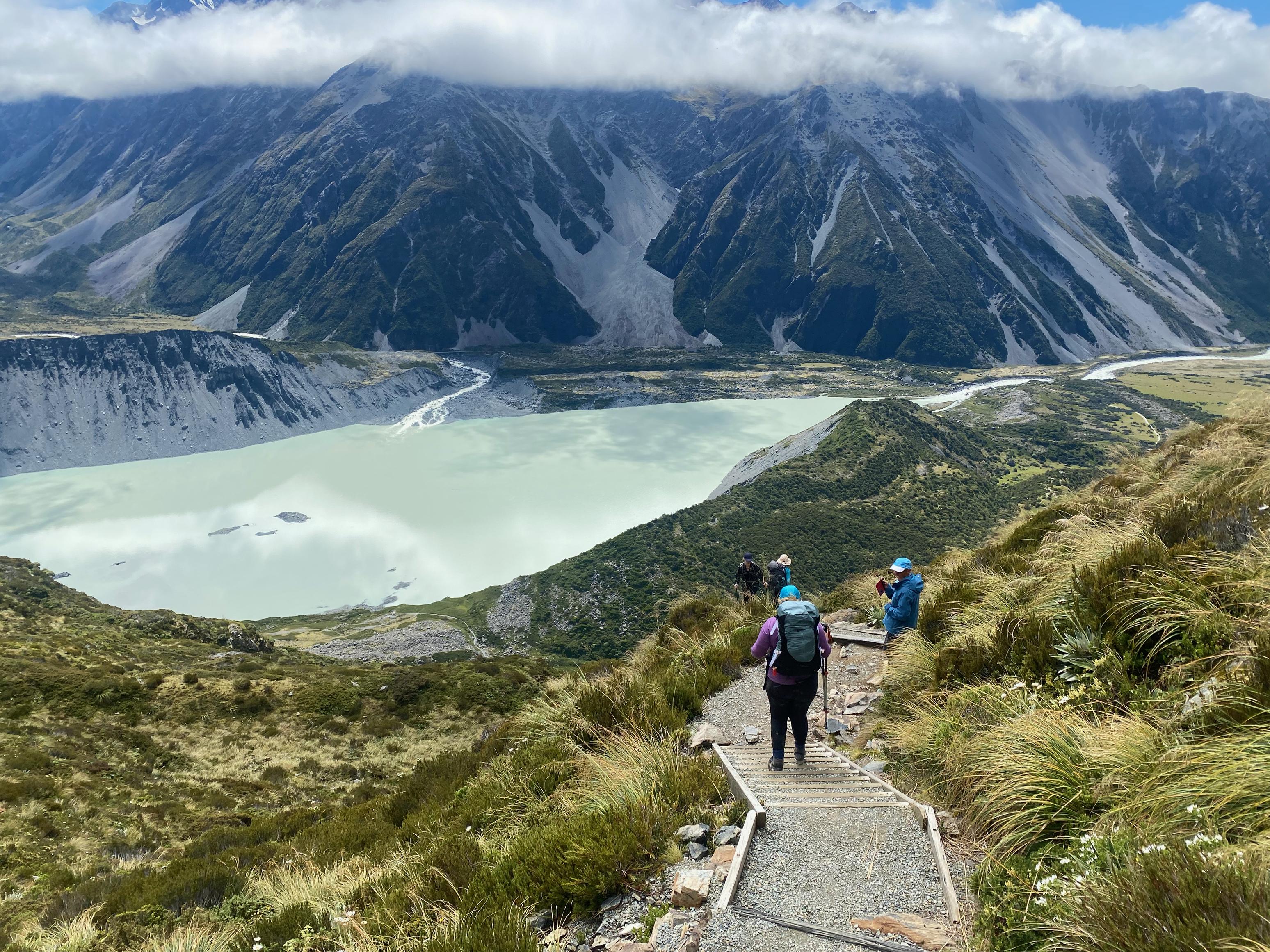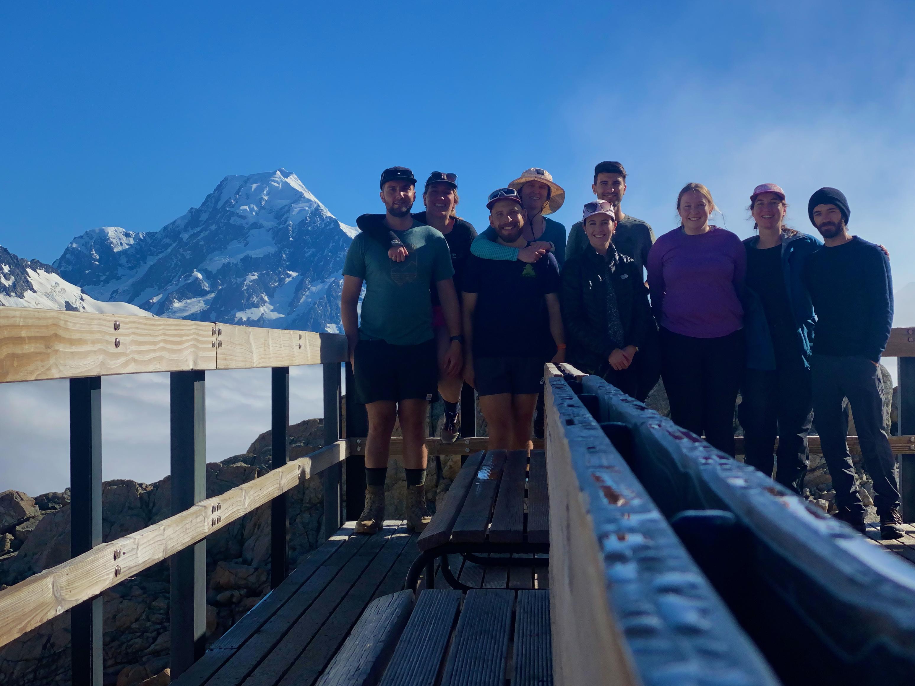 After that, we slowly had breakfast, cleaned up, and got ready to head back down. Louise and Daniel headed off a little ahead of the rest of us (determined not to slow us down) and the rest of us came a few minutes later. We met up for lunch at Sealy Tarns where the cloud had cleared enough to get a beautiful view up to Mt Cook, The Hooker Valley and surrounding areas.