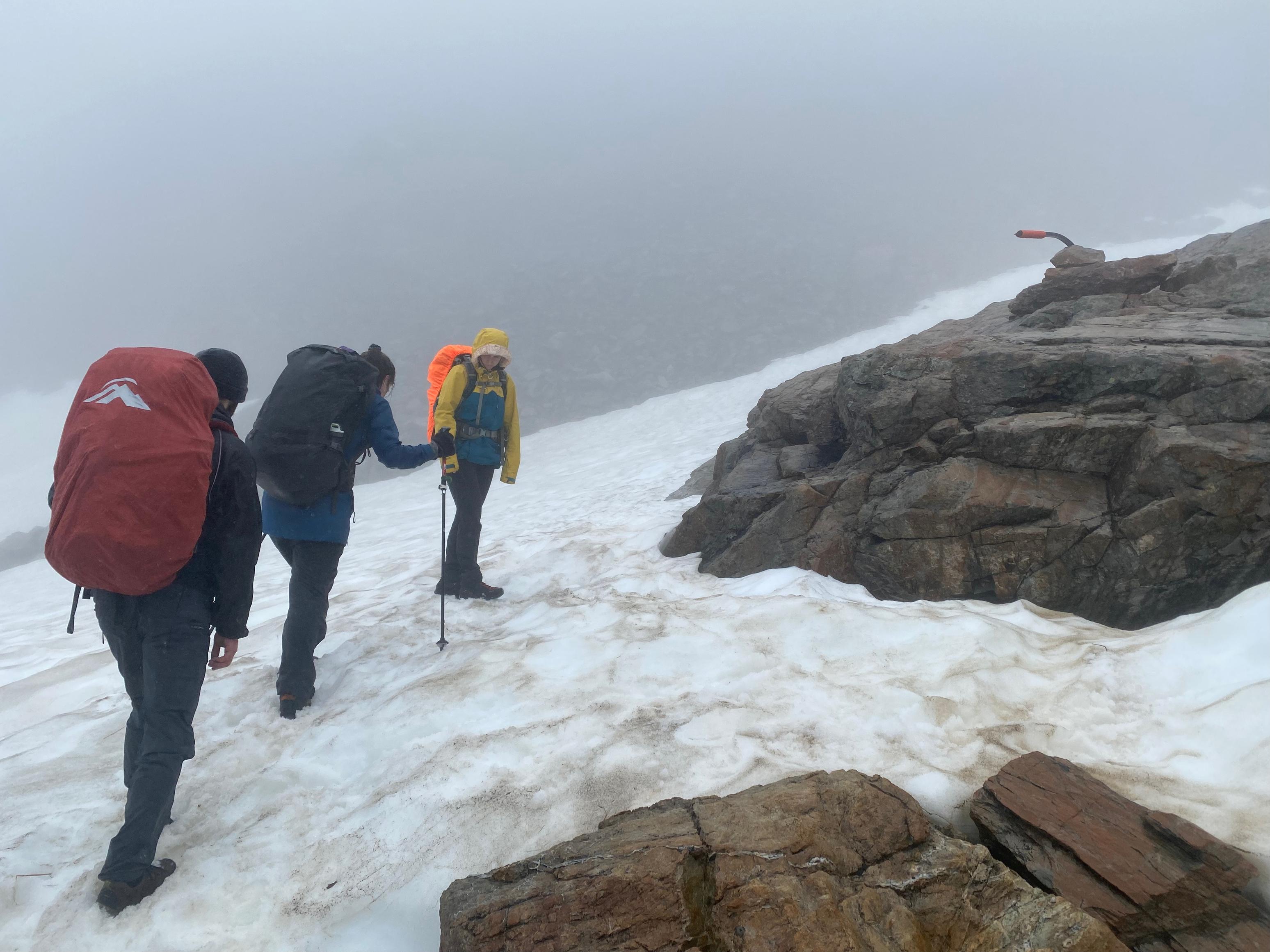 Once you turn off onto the ridgeline the track crosses a boulder field and then some more snow before reaching the hut. Through here it could be possible to lose your way in the cloud, so it was nice to have a NZ Topo app on my phone to double-check. We reached the hut with no issues and claimed some beds for the 9 of us.