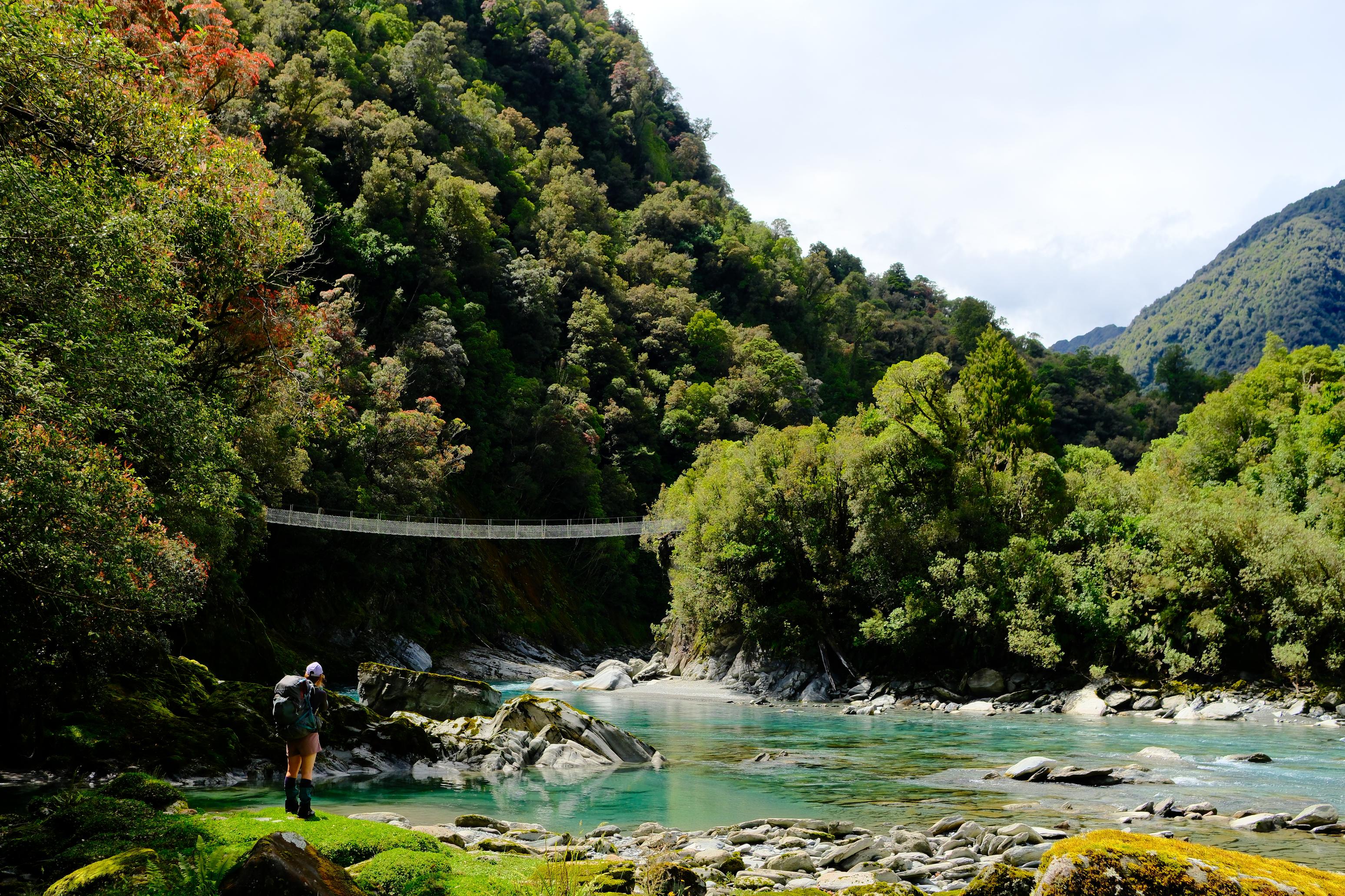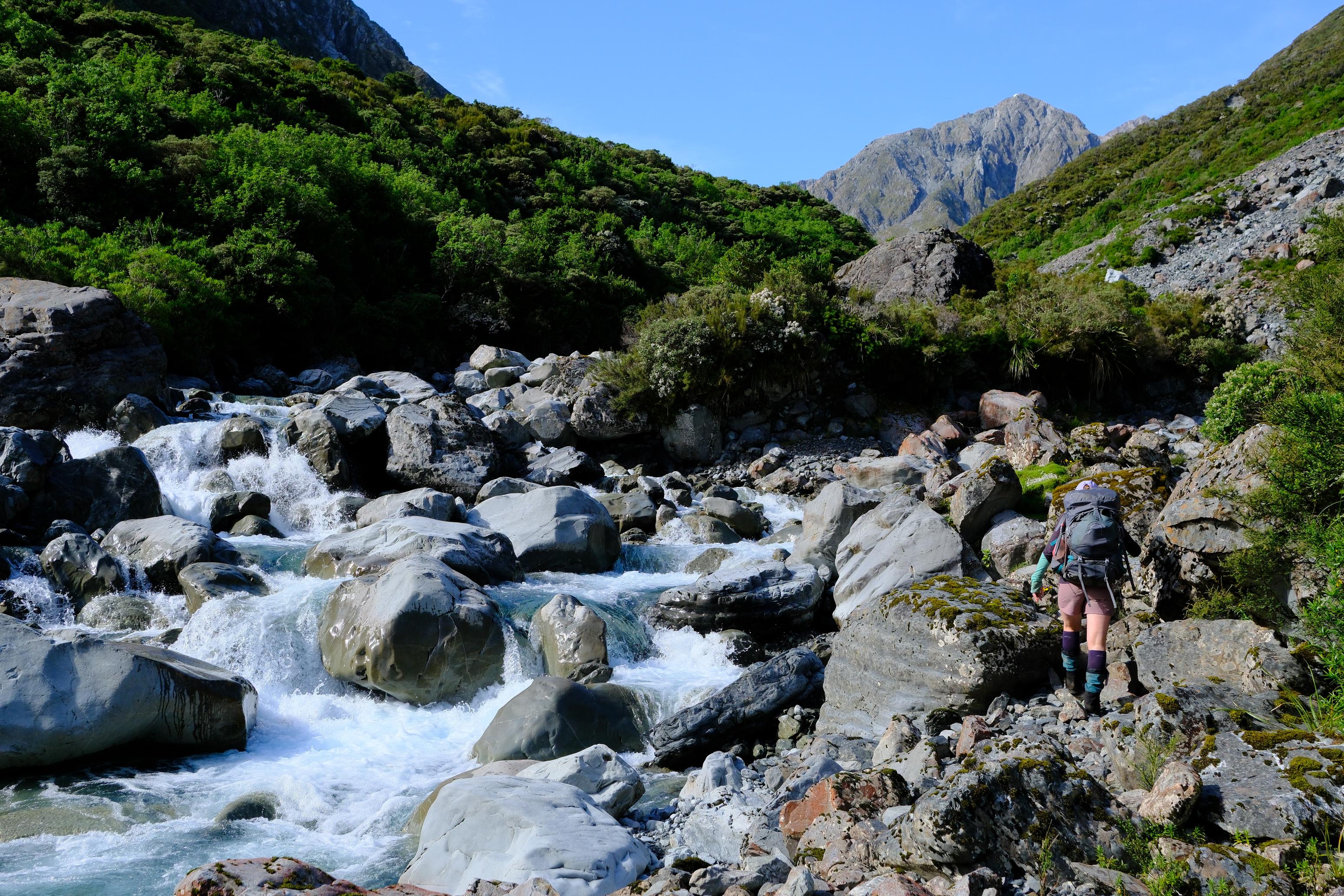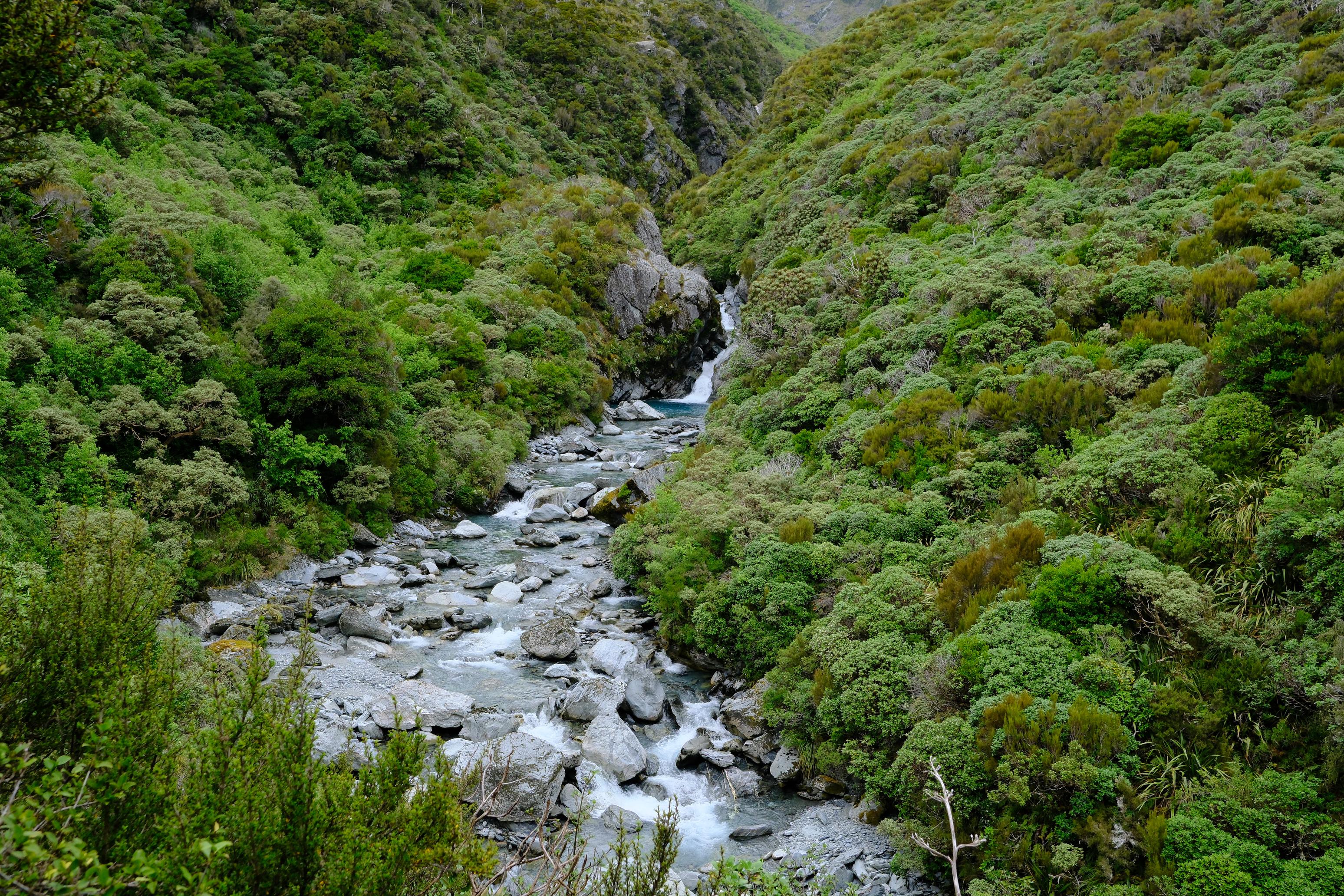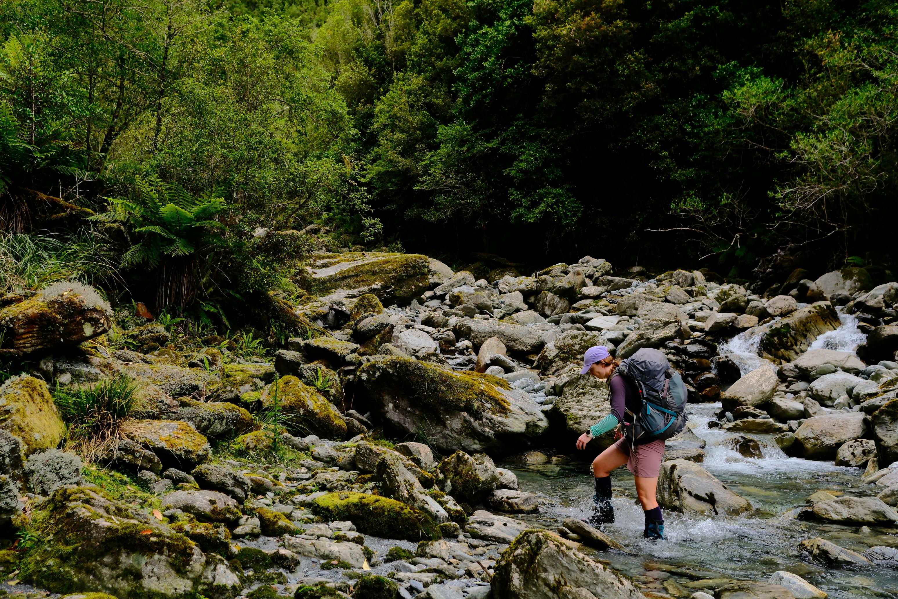 The track starts as described: across private land. Itโs all pretty simple here, although we were already sweating! Once you cross the Cesspool and get a great view of the river (and also a potential swimming spot) the track becomes an old logging road and so is quite wide and well-formed, but often dips down into washed-out creeks and across river fans. There are also a couple of sections of boulder-hopping next to the river but they were nothing to be concerned about.
