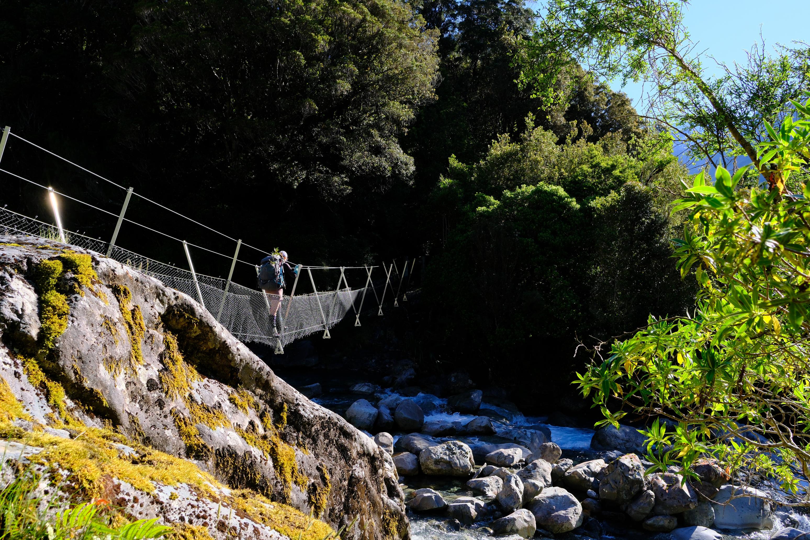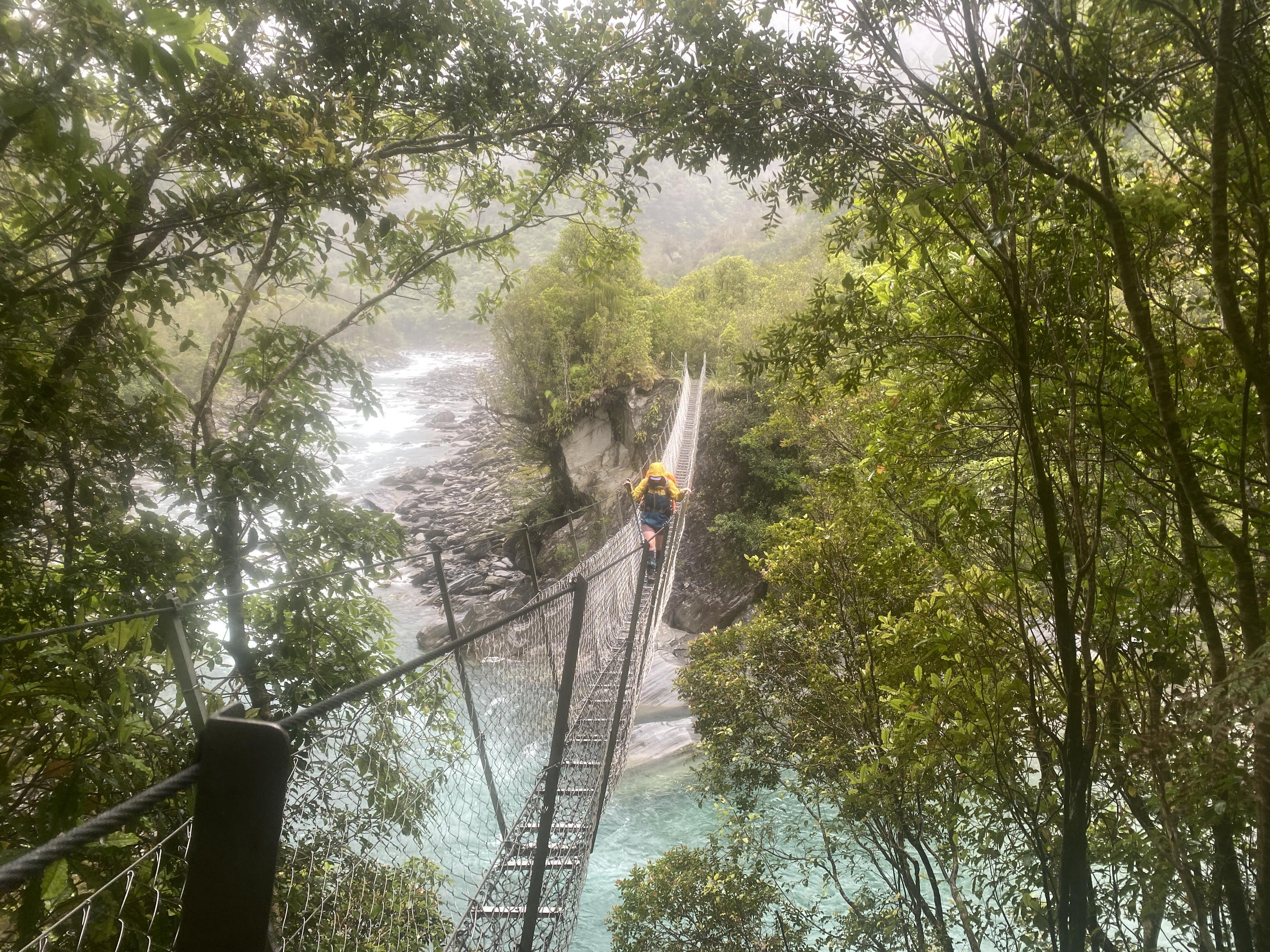 We hit Harman Hut at midday, perfect timing for an early lunch (compared to previous days). There we met two hunters who were out for a big trip. We soon trucked on but I was having a sad time with my feet - they had swelled and were starting to rub in new places (tops of my toes). Not a fan! The amazing swingbridge across Harman River made for a great interlude to the second half of the day, too. Then, after some morale-boosting snacks at the junction to Styx Saddle I felt a good deal better and distracted myself by looking and listening for deer on the track (three seen). As we neared Mud Flats Hut it started to spit, but thankfully it didnโt start pouring until after we reached the hut. Great success.