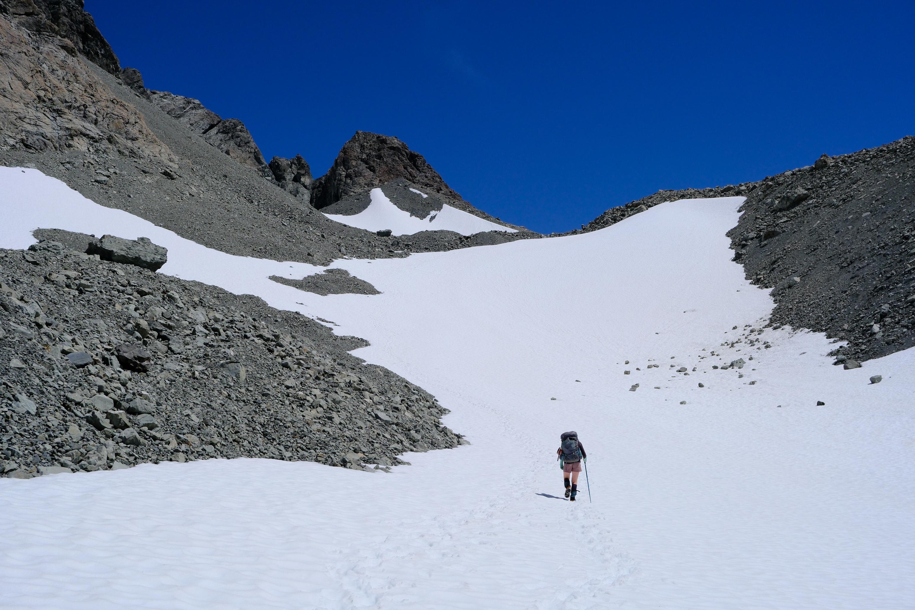We started early, having had very poor sleep and being woken early by the other party in the hut. The climbers got in around 11 pm (pitched their tents) and it sounded like their spirits were high, which is impressive given the epic day they must have had! We headed out feeling good and looking forward to the shorter day, slightly cooler temperatures and lots of time to read our books in Mud Flats Hut. The travel was straightforward to the bottom of Browning Pass, and the zig-zags mostly made sense, except for when they didnโt. When we lost them, we tended to go straight up until we could find another snowpole. The last few hundred meters were very steep and would be quite challenging to go down. They are exposed on loose rock and poor visibility of where to go. We later met a party that was going west to east and the weather was not looking good, so we gave them a heads-up about this potentially challenging/dangerous section.