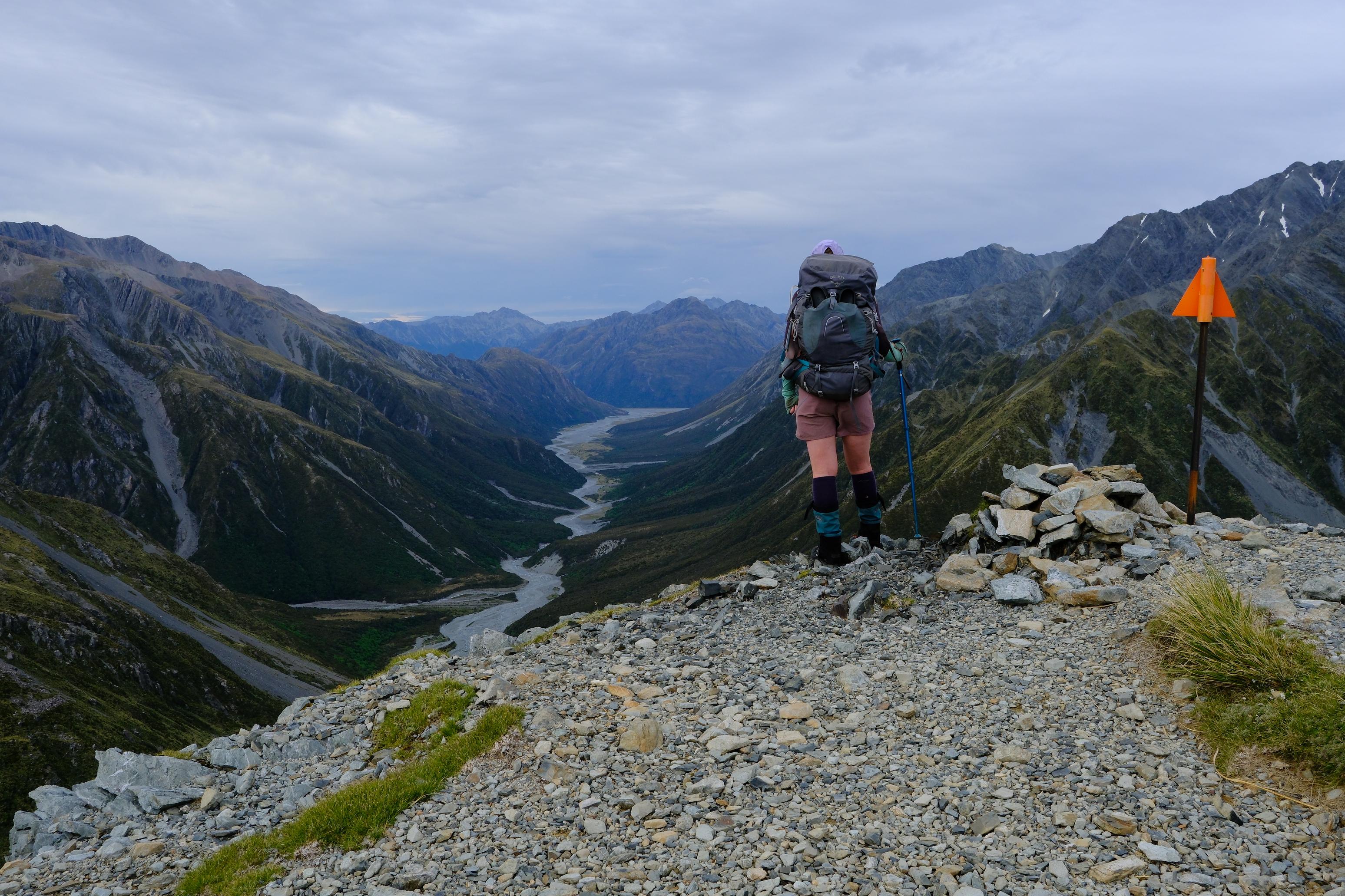 The view was absolutely stunning over both of the passes, and looking down into Cronin Steam was a bit intimidating but the route was actually very reasonable. We didnโt find it at all sketchy and managed to get onto a good trail well above the river (thanks, Remote Huts!). We could tell the route was much better because we powered past a group of three who were battling away down near the creek. We stuck to the true left and kept a lookout for the promised tarn and orange marker to get back onto a track. It came much later than we thought, but we found it in the end. From there it was a straightforward amble to the hut along a well-formed track (as promised).