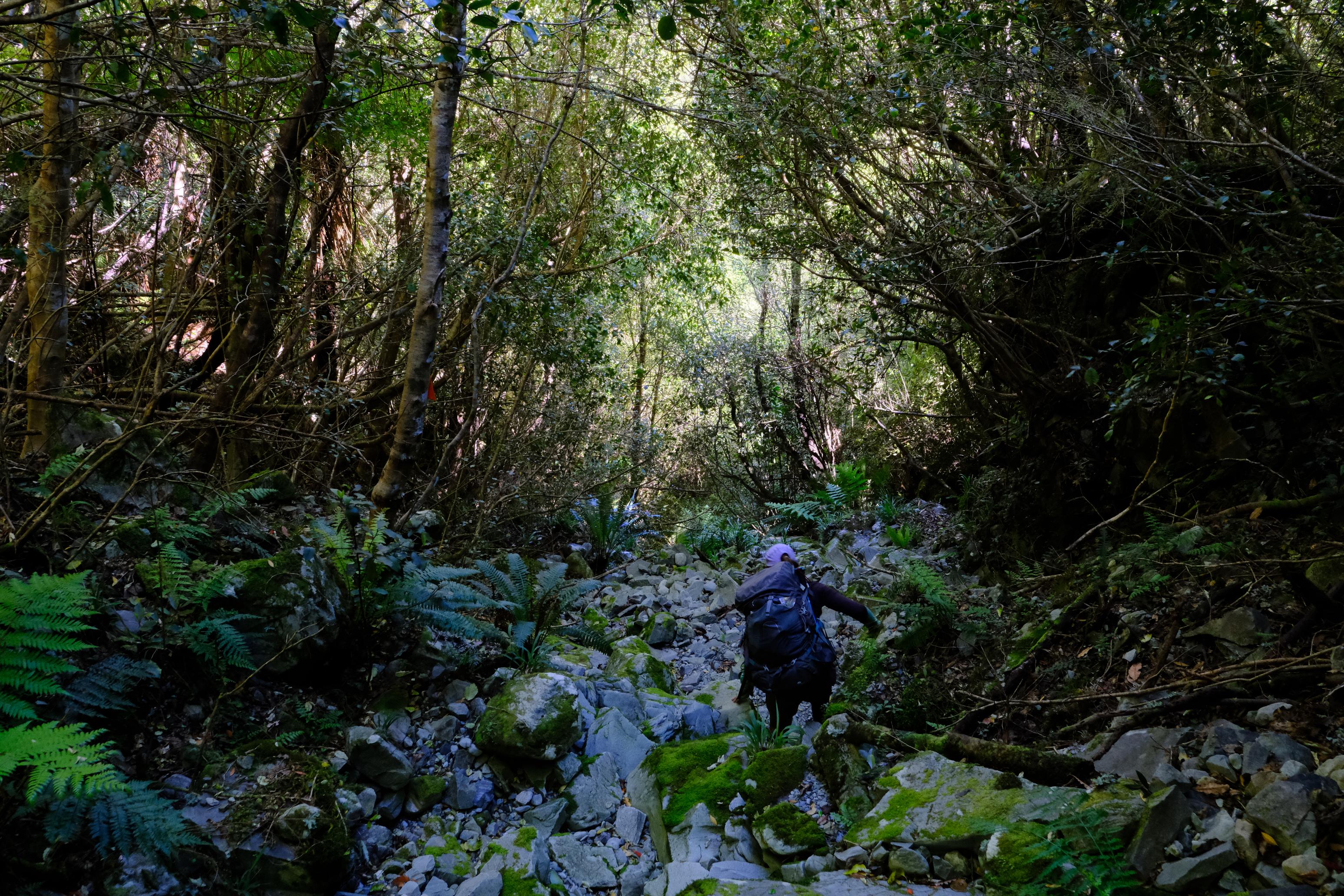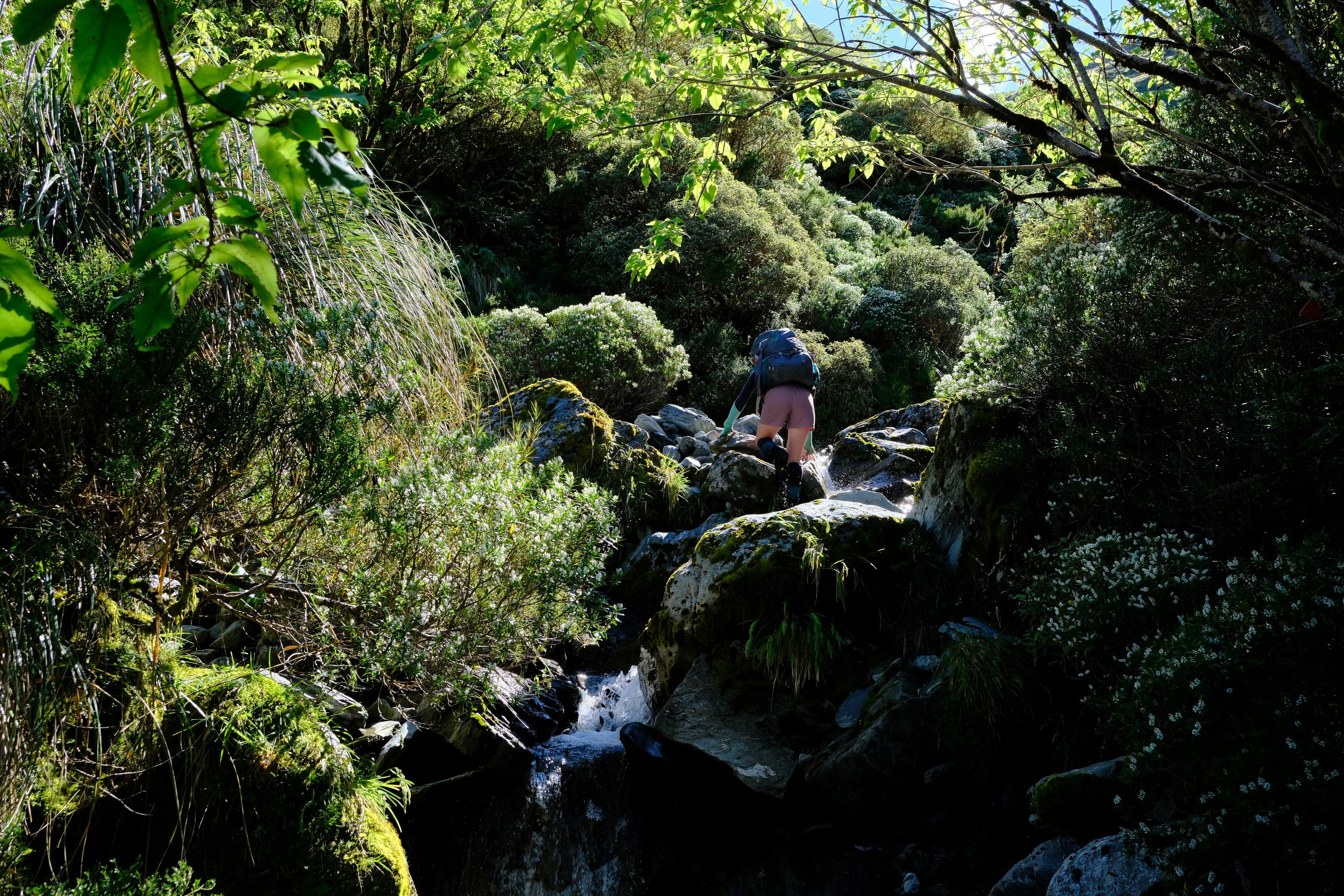 Speaking of washed-out creeks: there was a short slog up an unnamed washed-out creek which was surprisingly hard work. From there the track climbed quite high above the river - to the point where it was out of sight and almost out of hearing. You cross a completely epic waterfall which comes (near vertical) crashing out of the trees and past you into the forest below. Thankfully, it is not so steep that you canโt sidle through it - although, this would be a less-good time if it had been raining recently.