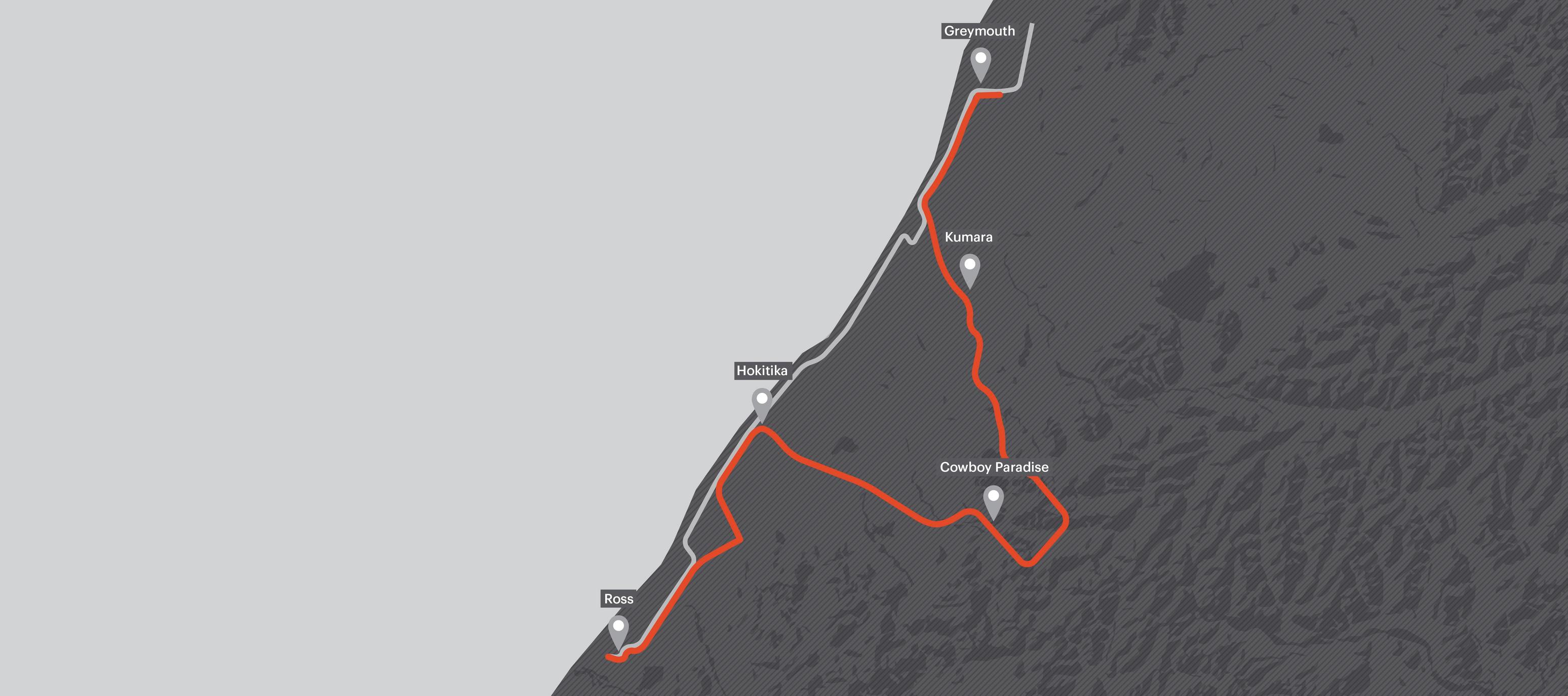 From the end of the race the trail joins the main road back to Hokitika, departing from the road to coast along the Hokitika-Kaniere Tramway before reaching town.
