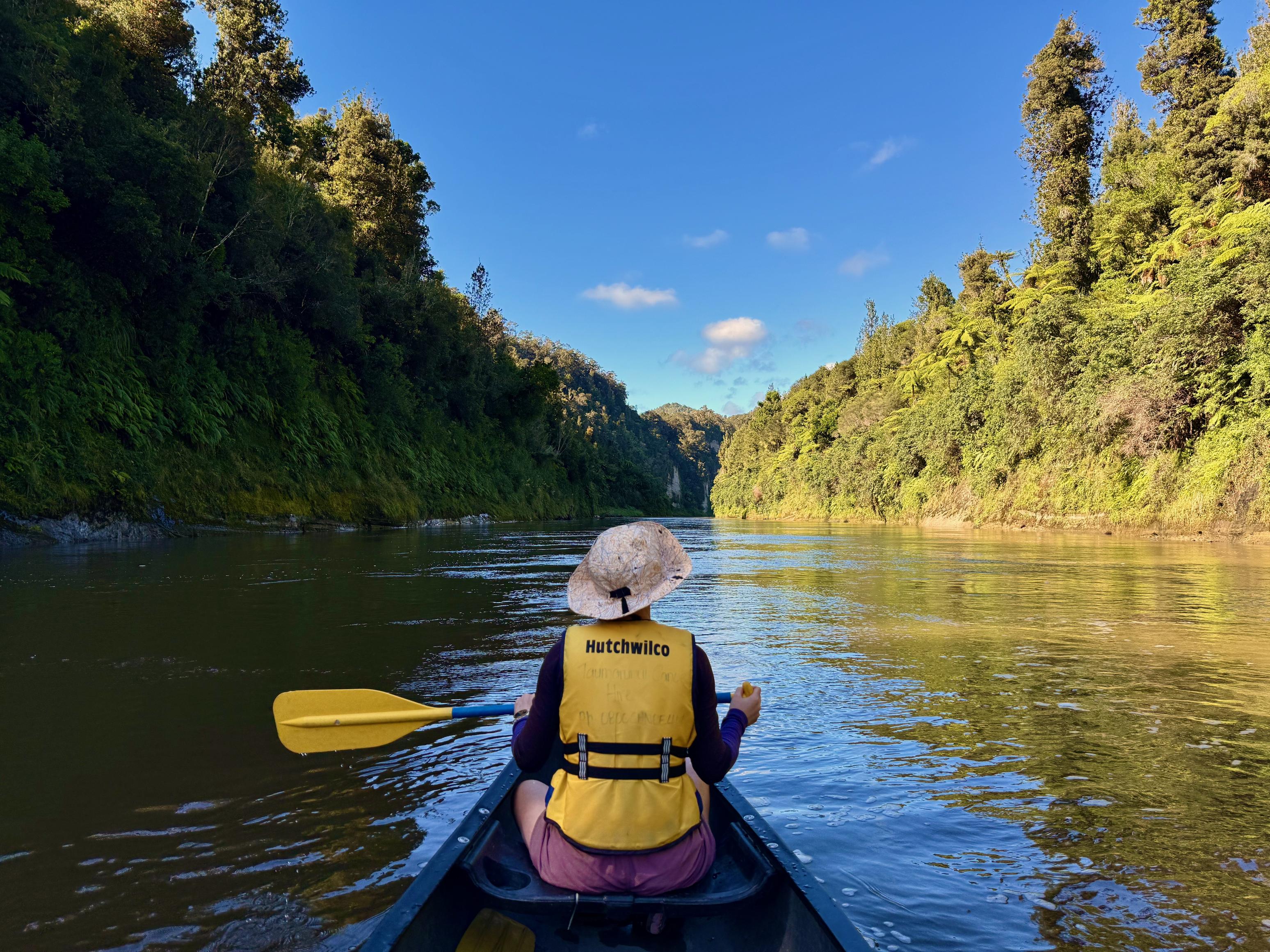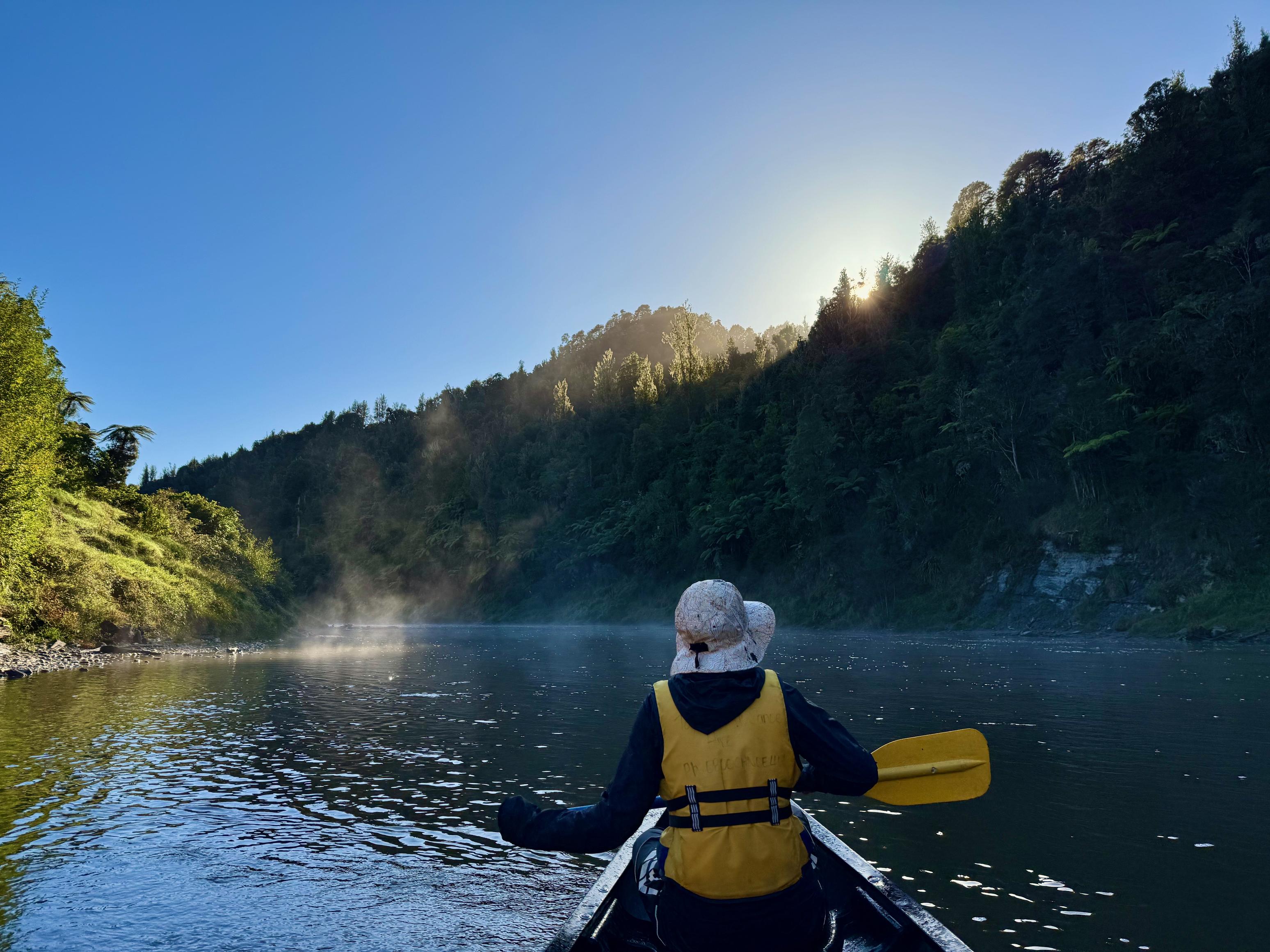 It was chilllllly when we woke in the morning, but there was no time to much around waiting for it to warm up, so we packed up and hit the river fairly quickly. As we set off in the morning, mist rose from the water as it was warmed by the sun and the sky beamed blue above us. By this time, we were well into Whanganui National Park and the surroundings were stunning. We had a relaxed paddle down to Mangapurua Landing where we hopped out of our boats (with much difficulty) and walked the short trail to The Bridge to Nowhere. It turns out that with the completion of the bike track, it is now a bridge to somewhere (Whakahoro). Still, it’s a great view and a nice bit of bush to walk through! We were pleased to stretch our legs.
