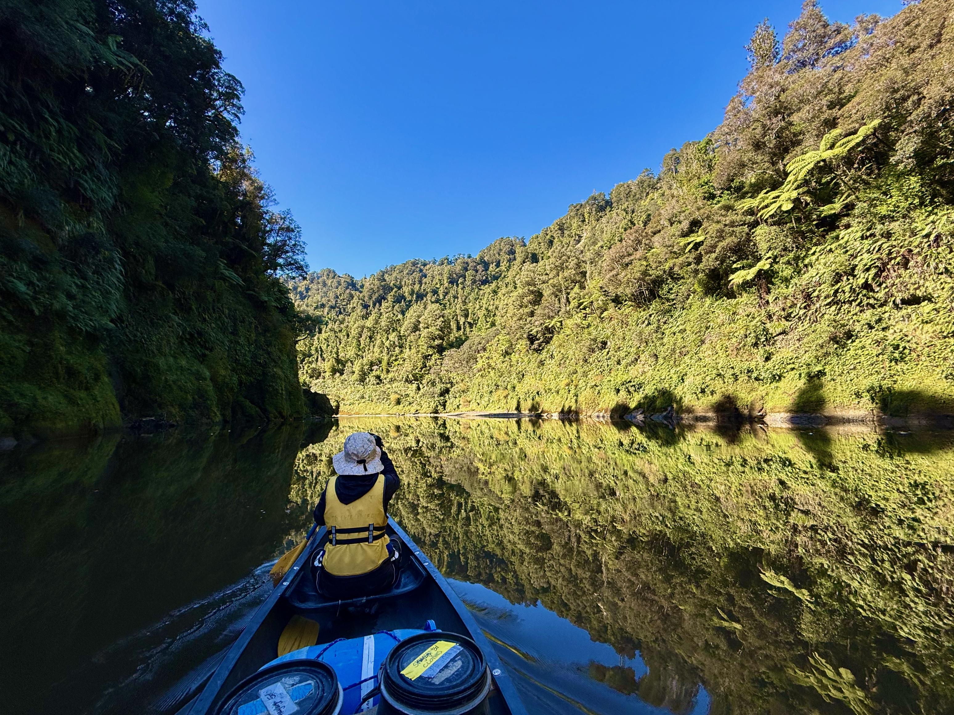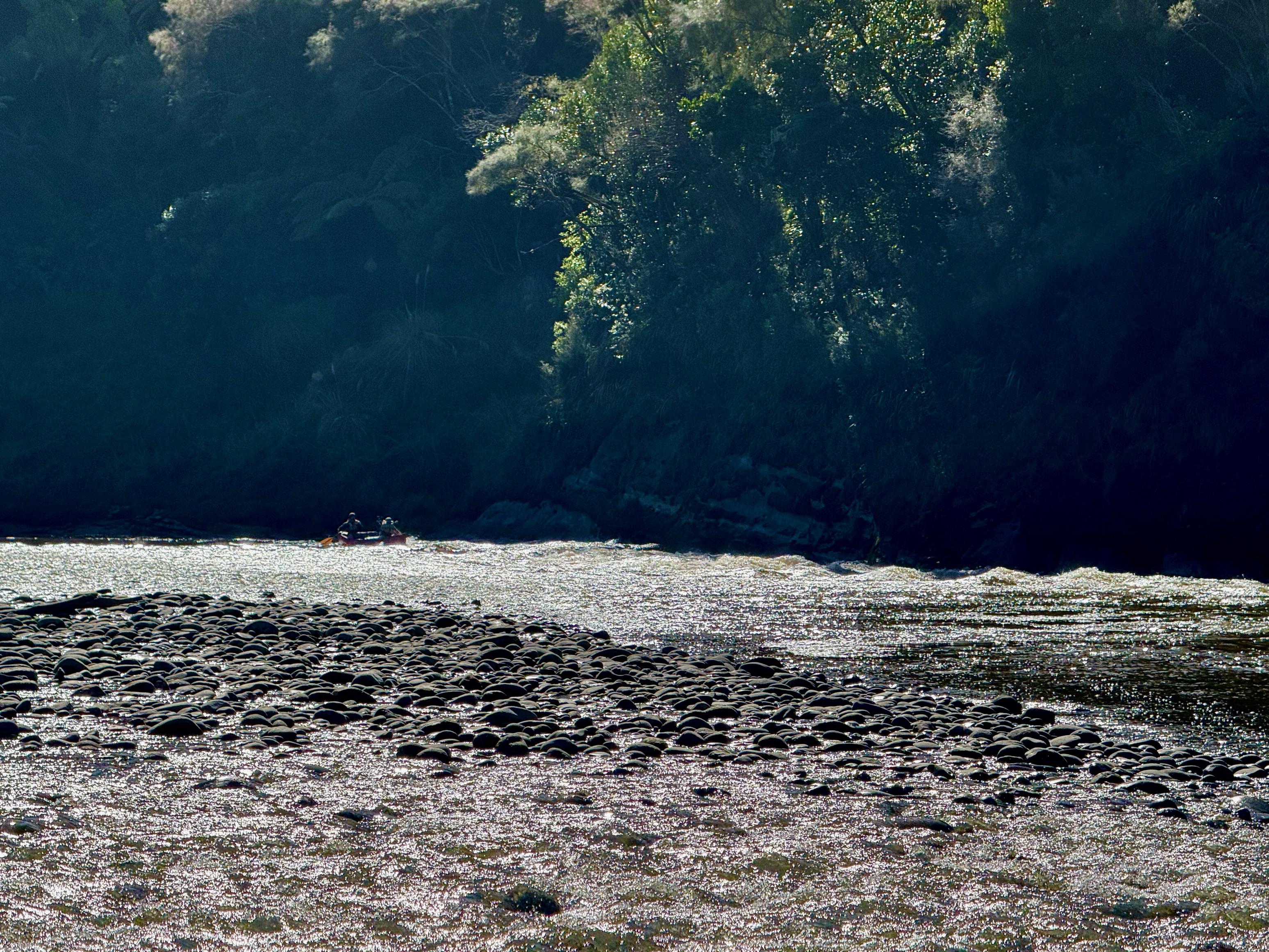 Thankfully, the river opens out and the rapids diminish. The broad, slow-moving featureless water is more characteristic of the Whanganui, and it allows ample opportunity to admire the views along the way. We stopped at Lauren’s Lavender to get some kai and coffee and also to dry off in the sun. Alas, we had missed the lavender season and it had recently been harvested. We also briefly stopped at Ohinepane Camping Area but were advised to go to Poukaria instead, since Poukaria is not accessible by road and would therefore be less busy.