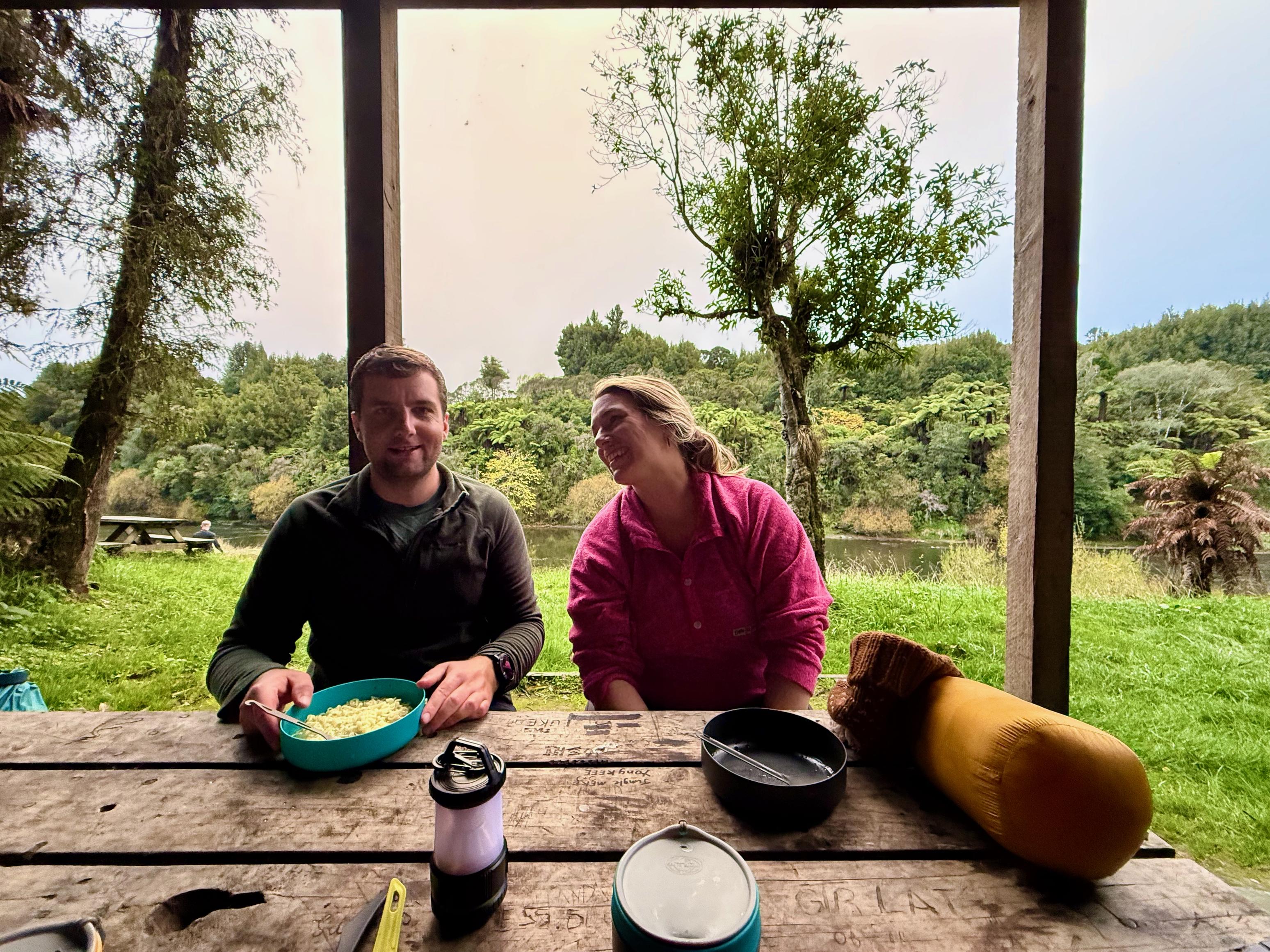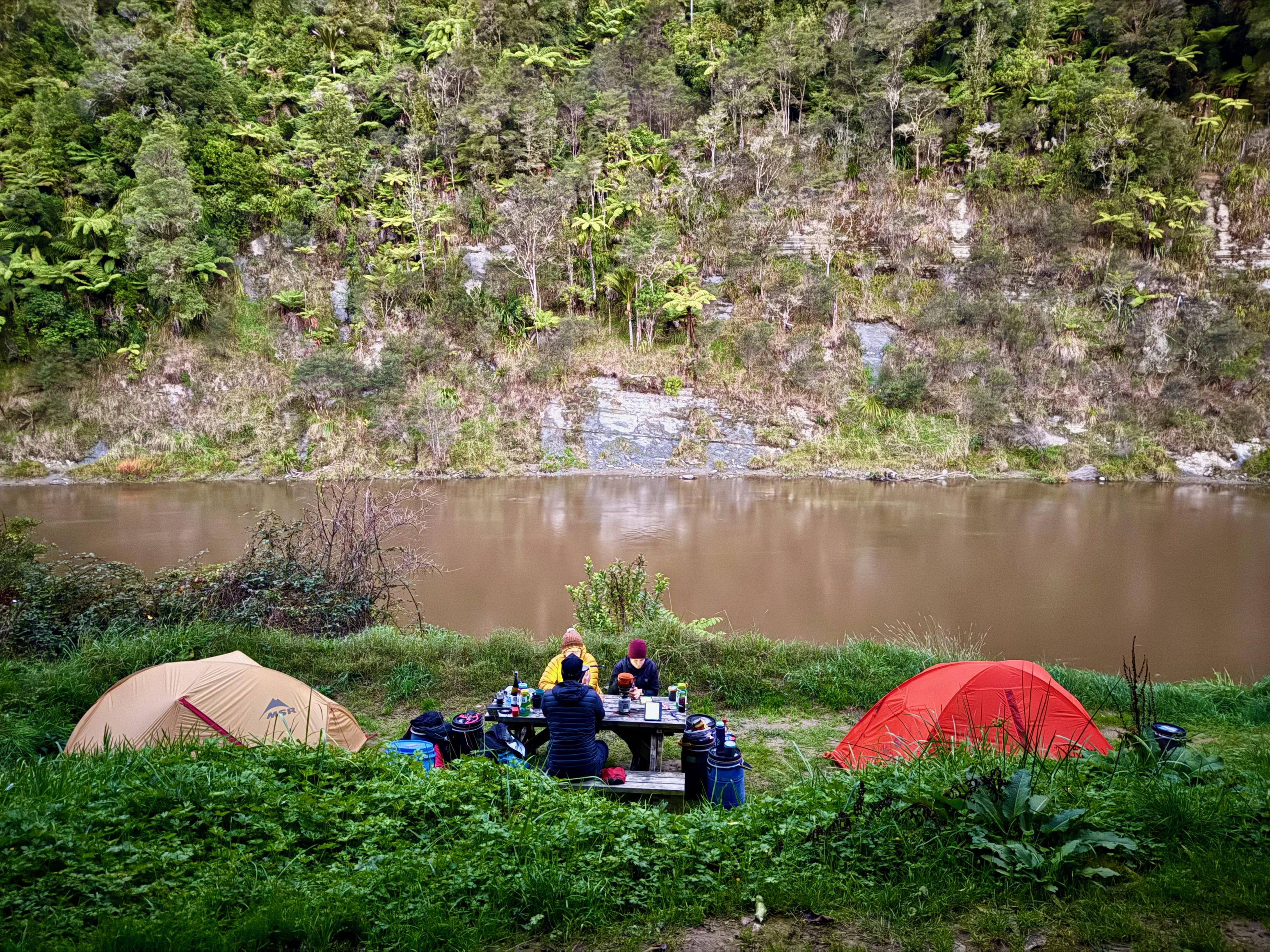 The rest of the paddle was uneventful and we soon reached John Coull Hut and Campsite, which, it turns out, is huuuuge! There are multiple terraces with 26 tent spaces, and also 24 bunks in the hut. It would be a hugely busy campsite in peak season. Even during the off-season, we found it quite busy: most terraces had tents, but it wasn’t quite as cramped as I could imagine it could be. Part of the reason that it was so busy was that groups that are doing the 3-day trip get on the water at Whakahoro Campsite (where we lunched the previous day), and it seems the 3-day trip is very popular, especially with families.